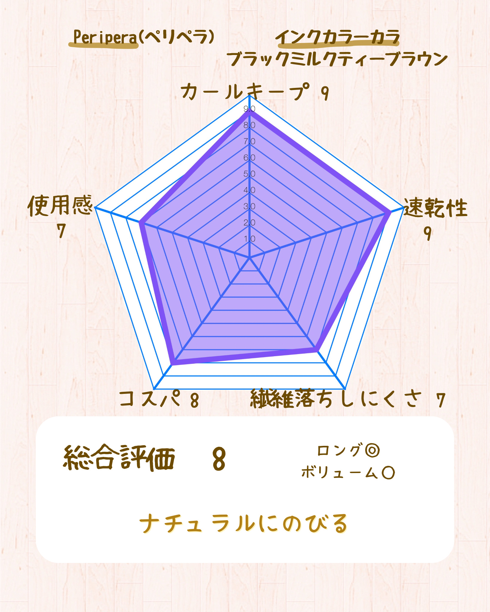 ★ペリペラ インクカラーカラ(マスカラ)2号ブラックカラ ミルクティーブラウン★価格★Qoo10や公式サイトで送料無料込み1000円で前後★使用感★基本ナチュラルです。重ねて濃くもできます。重なり方も綺麗でダマにならないのが嬉しいポイントです...