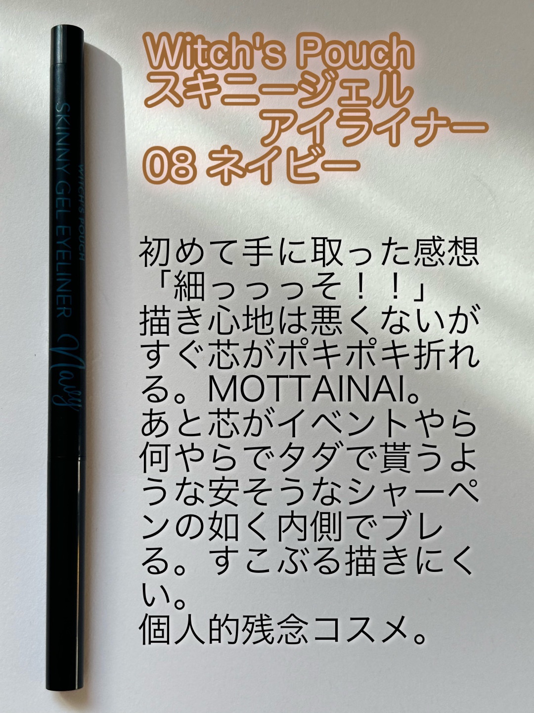 Witch'sPouchスキニージェルアイライナー968円(税込)普段使いに最適なベーシックカラーから、トレンドカラーまで豊富なカラバリ🤍1.5mmの極細芯が使いやすくて最高💗ヨレにくく汗や水で滲まないのも推せるポイント🥺🤍腕に描いてゴシゴシ...