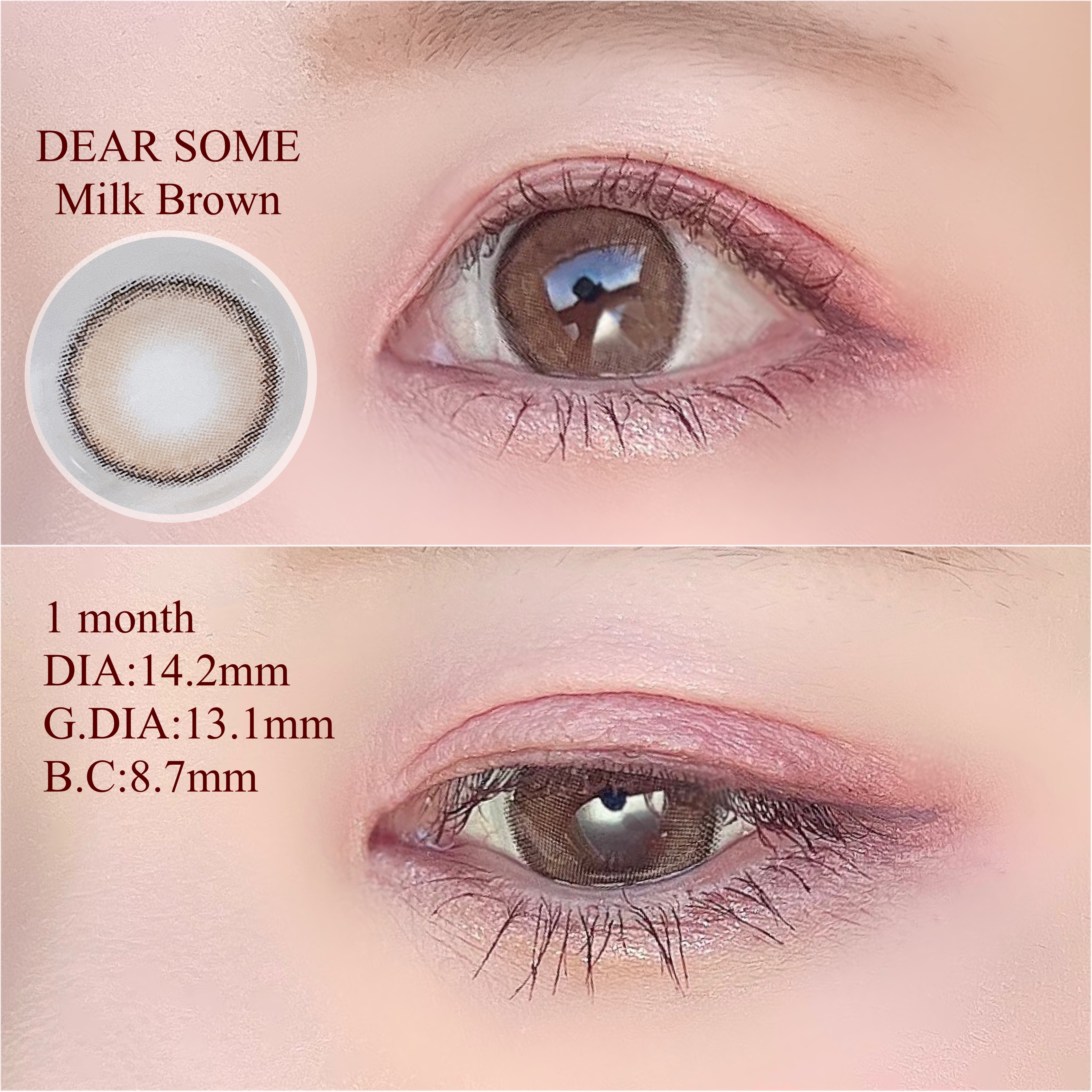 クリーミーで色素薄めのレンズ🙌 フチがある事でくっきりした目になります🥰 #1ヶ月用カラコン #DEARSOME シリーズ B.C 8.7 DIA 14.2mm 着色直径 13.1mm 含水率 43% #MilkBrown UVカット、サンドイッチ製法 2箱2枚入り ¥1,690(税込)