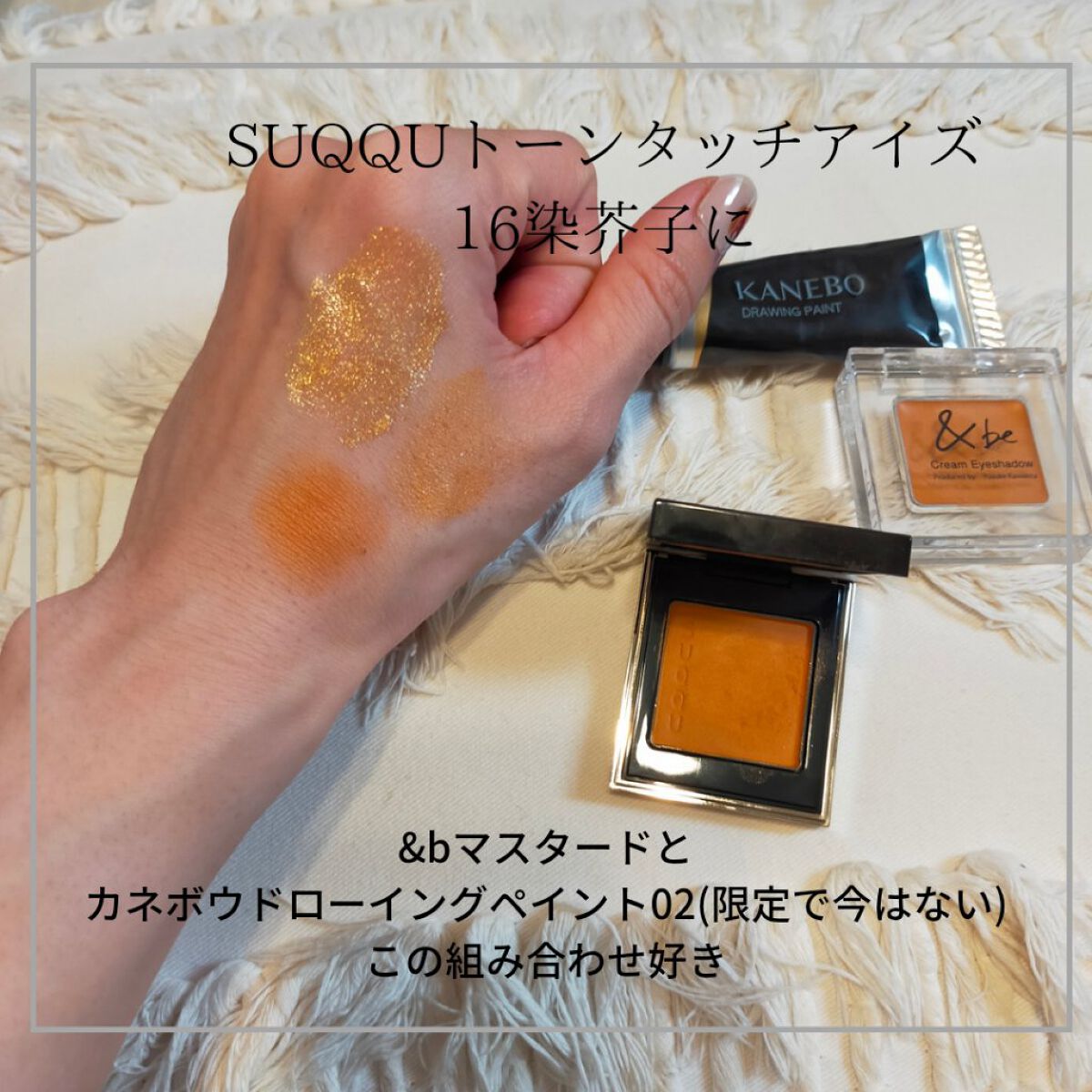 💛💛SUQQUお気に入り💛💛最近お気に入りのSUQQUの毎日使うものだけを💓一目惚れして何度もタッチアップして悩みに悩んで購入した#SUQQUトーンタッチアイズ16#染芥子-SOMEKARASHIこれは使い方思っているより簡単にオシャレ顔にしてくれます!単品でも色々合わせるのも相性良くて好きです。#シグニチャーカラーアイズ04#純撫子-SUMINADESHIKO染芥子-SOMEKARASHI使う時にこの赤みのあるピンクと合わせても可愛いくてお気に入り最近こちらも出番が多くて他のも気になります!#KANEBOカネボウドローイングペイント02GlamGold(限定品)ギラギラのゴールドラメのクリーム?リキッド?使うとより発色きれいで目元にアクセントなります。リキッド系ならなんでもいいと思います!SUQQUのリキッドが欲しかったけど似てるのあるかもと思って代用したら案外大丈夫☺#&beクリームアイシャドウマスタードこれはあってもなくてもいいけど、マットに仕上げたい時のベースに丁度よいです。アイシャドウベースとして使用したりイエベ系のアイシャドウと合わせたり#ピュアカラーブラッシュ06#春菫-HARUSUMIREこれ、グラデになってる紫のところ上から付けると肌めちゃ綺麗に見えて買ってよかった✨#リタッチプレストパウダーポーセリン01エンドレスリピート確定この2つはパケ薄くて持ち運びにもお治しにも大活躍!#SUQQUが好き#Autumnメイク#純欲風メイク#今月の購入品#本音でガチレビュー#毎日メイク