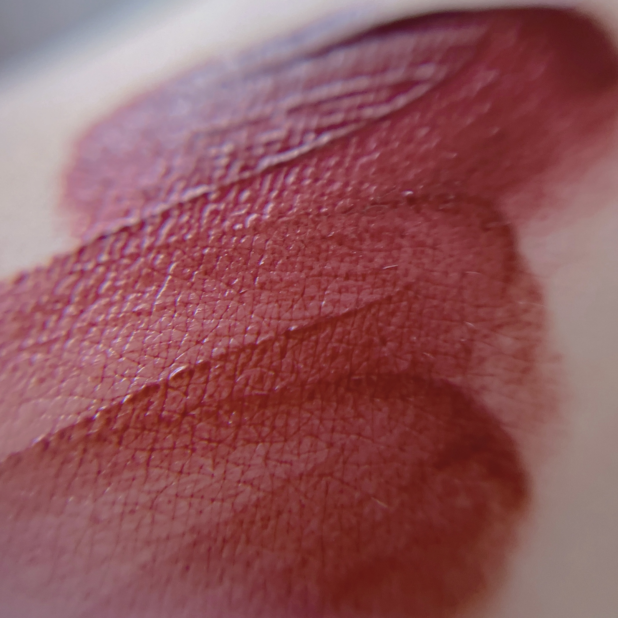 色味 電気の下だとよくわかるように、深いモーヴピンク。黄味はなく、青みのある深いピンクレッド。ピンクの要素強め。ブルベ向き。 質感 単体で使うと乾燥しやすそうなので、リップをつけるかグロスを塗ろうと思います 保湿 △ 時間が経つと乾燥してきます。
