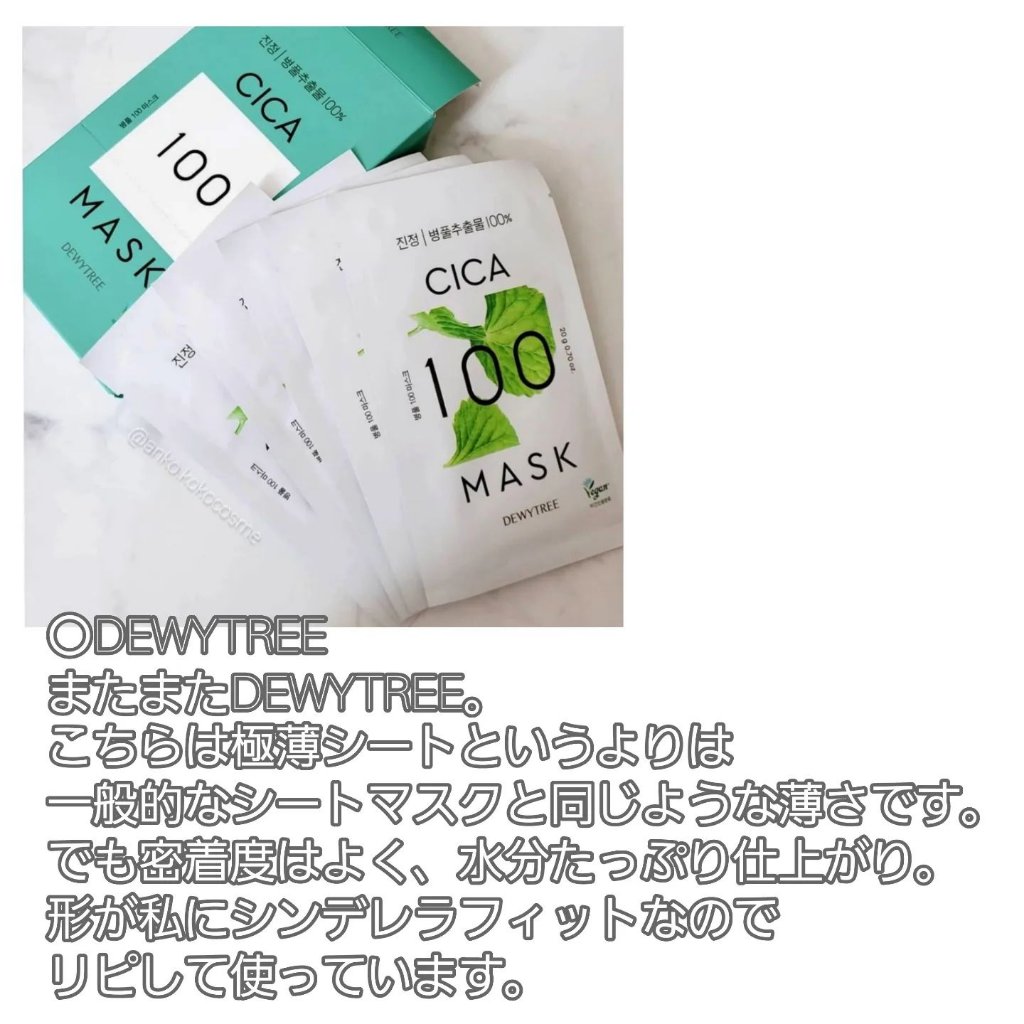 DEWYTREEのCICA100マスク🌿頂き物です🙌シートがガーゼのようなタイプで、私はあまり肌にフィットしている感じはしませんでした💦液はひたひたで、しっかり量があります!結構ゆるめの液なので、顎から液が垂れてしまうことがあって、何か作業を...
