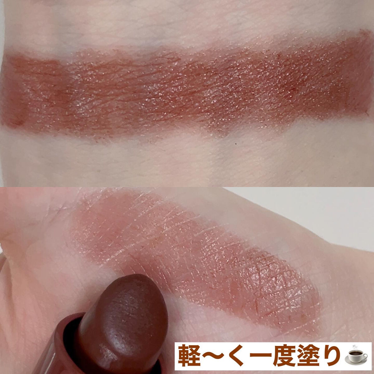 シアー感のある質感なのめ、抜け感があり このリップ1本でこなれ感を出すことができます! つけ心地がすごく軽く 塗った瞬間ピタッと密着してくれるので マスクにも比較的付きにくいです🙆♀️ リップクリームを付けたような潤い感があり 乾燥もしにくいところも◎ リッチココアって名前も可愛いですよねっ❤️ イエベさんだけでなくブルベさんも似合うカラーだと思います! 冬にたくさん使いたいおすすめブラウンリップです☃❄