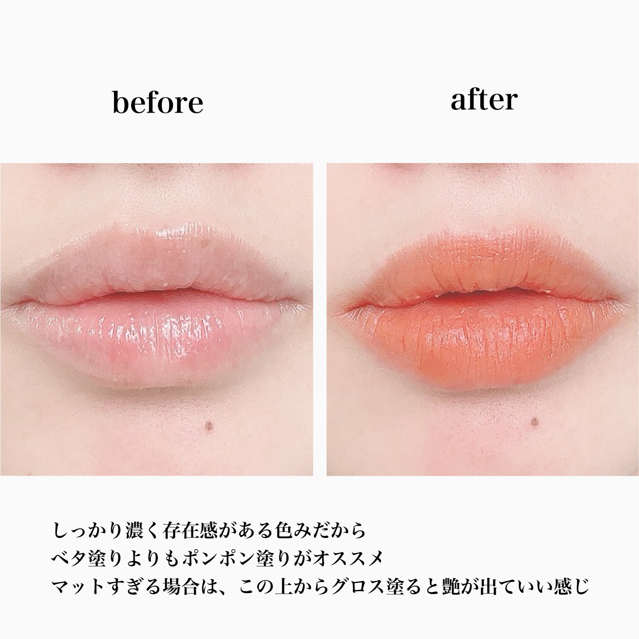 明るめのオレンジ-ブラウン系 ベルベットのような仕上がり、マットタイプ ふんわりした使用感、べたつかない感じは好み はっきりした色味で、ボリュームダウン気味の口元がパキッとした印象に…