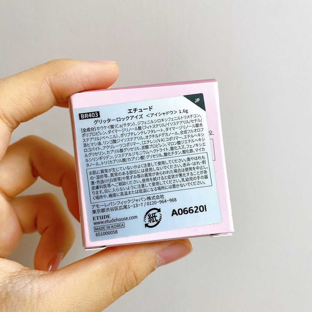 ETUDEグリッターロックアイズBR403グリッターというだけあって、きらきらのアイシャドウ。テクスチャーは固いけれどラメがこれだけ入っていれば当然というレベルなので気にならない。...