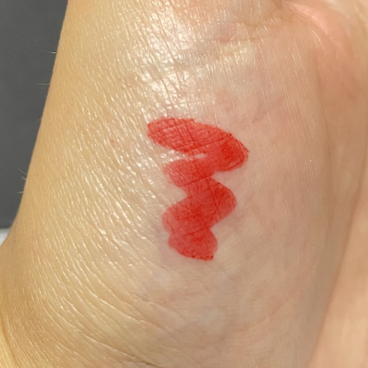 パキッとした色ですが肌なじみがよくて顔がぱっと明るくなります。 ティッシュオフなし、一度ぎゅっとティッシュオフ、ティッシュでゴシゴシした写真を載せています😊 スウォッチしてみてティッシュでゴシゴシしたあとも、オレンジの色味はしぶとく残ってくれているので元々の唇の色があんまり良くない私には本当〜にありがたいです🙏