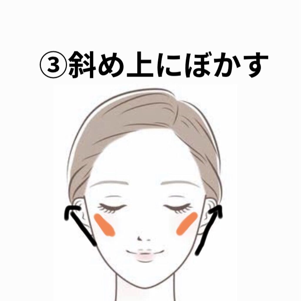 面長さんは、顔が縦に長く見えちゃうので縦の長さを縮めるために平行を意識してチークを入れる事! ぼかすときに斜め上に向かってぼかす! そうする事で顔が引き締まるし、余白を埋める事ができる!