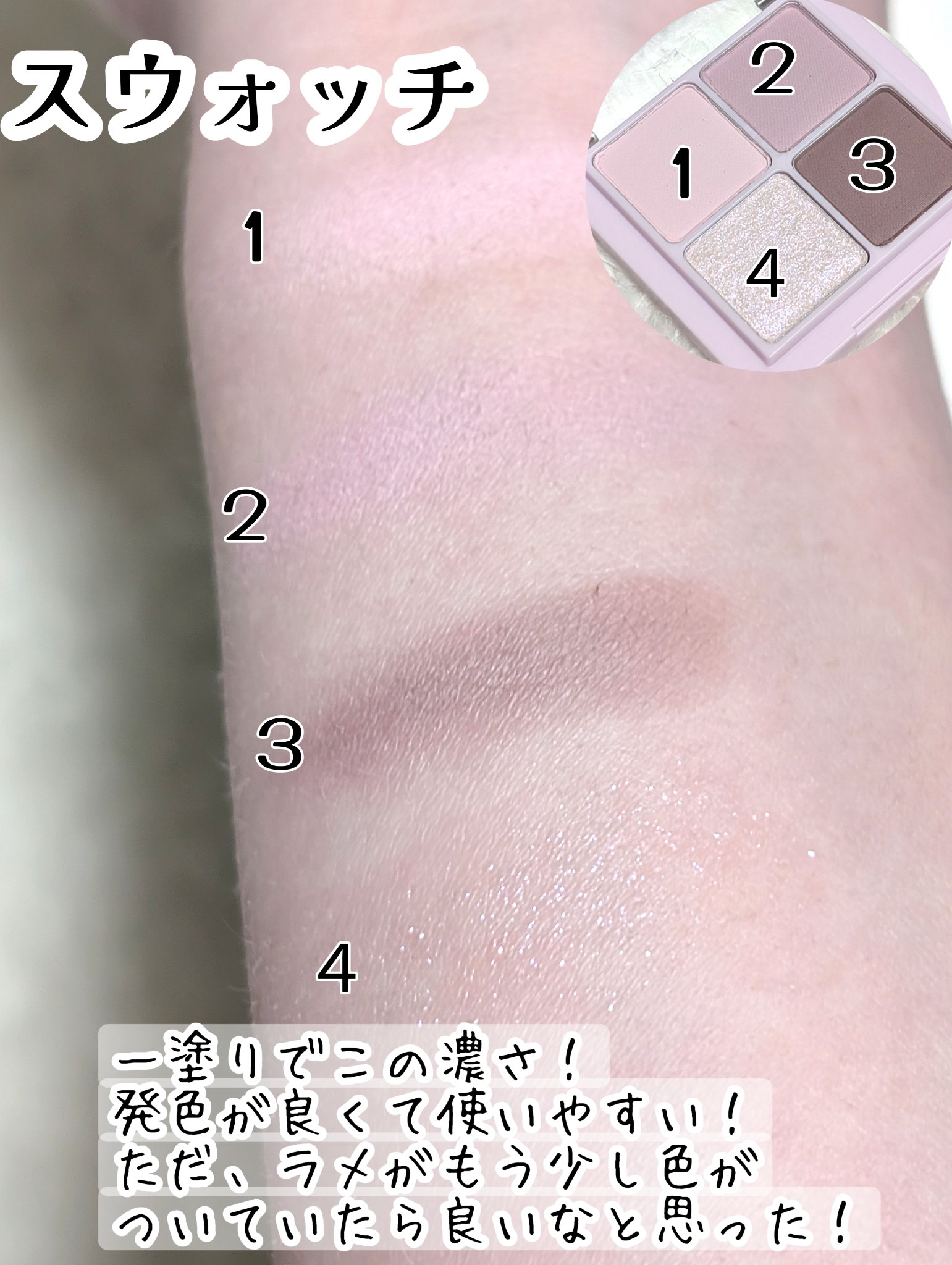 淡めカラーのラベンダーですが、マットもラメも指塗りでもブラシ塗りでも綺麗に発色で高密着◎ 4色を順番にのせていくだけで簡単にアイメイクが出来るのが良き◎ キラキラすぎないマットなラベンダーカラーのアイシャドウやをお探しの方にオススメ💁♀️