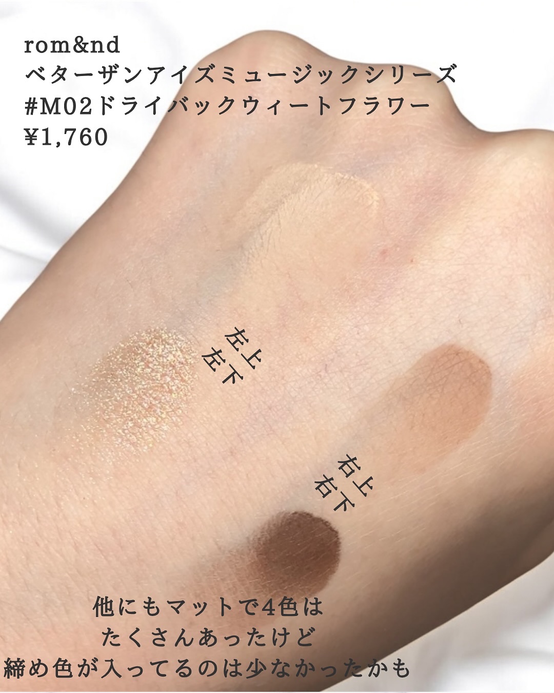 rom&ndベターザンアイズミュージックシリーズ#M02ドライバックウィートフラワー粉が柔らかいラメのキラキラ具合褒められたシェーディング、アイブロウにも使えた自然な涙袋が描けるグラデーションもバッチリ低彩度なのにくすんでみえない...