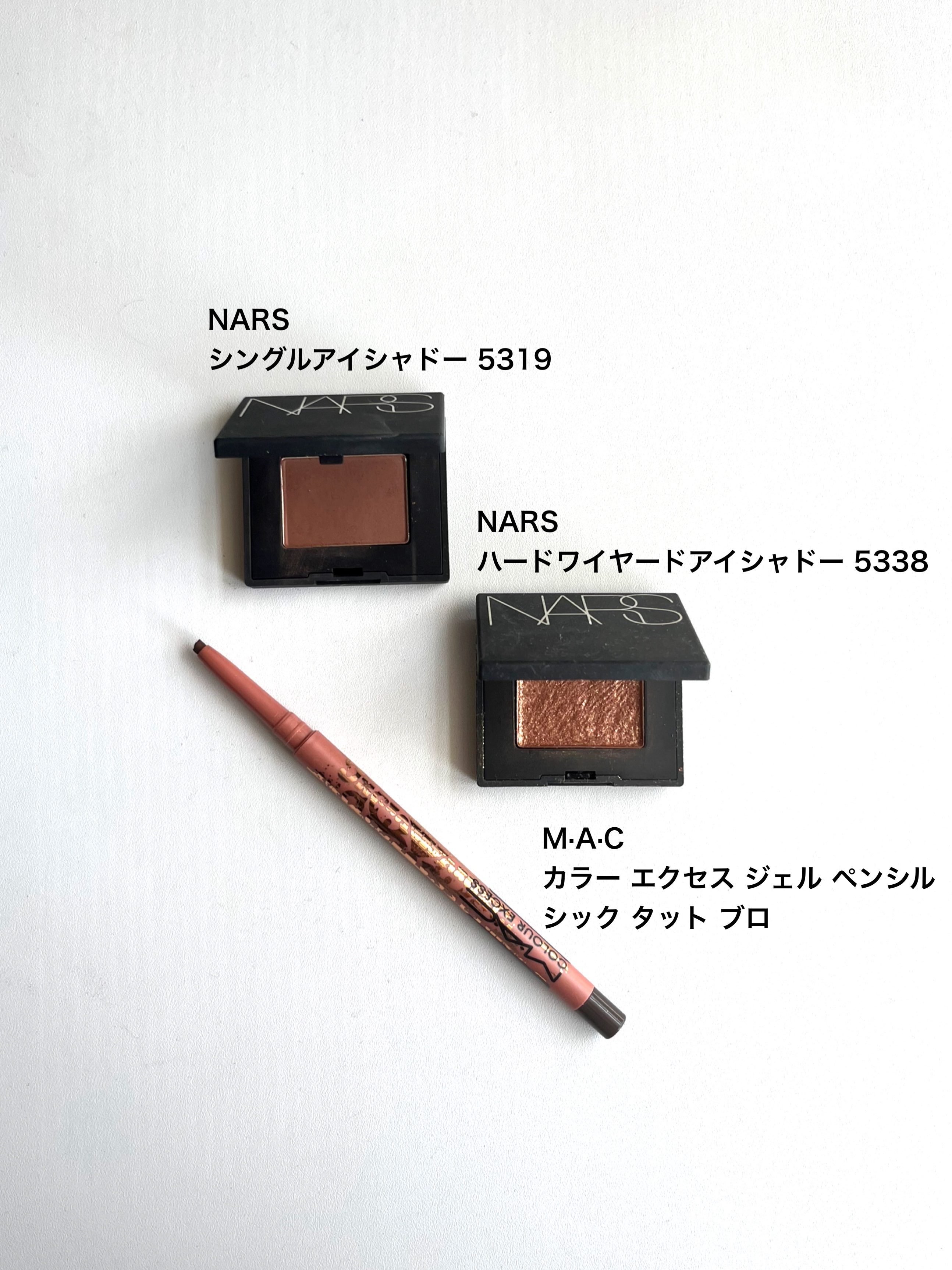 アイシャドウ #NARS #シングルアイシャドー5319 マットリッチクールブラウン ハードワイヤードアイシャドー5338 イリデッセントソフトゴールド リップ #オーディシャスリップスティック9477 チェスナット