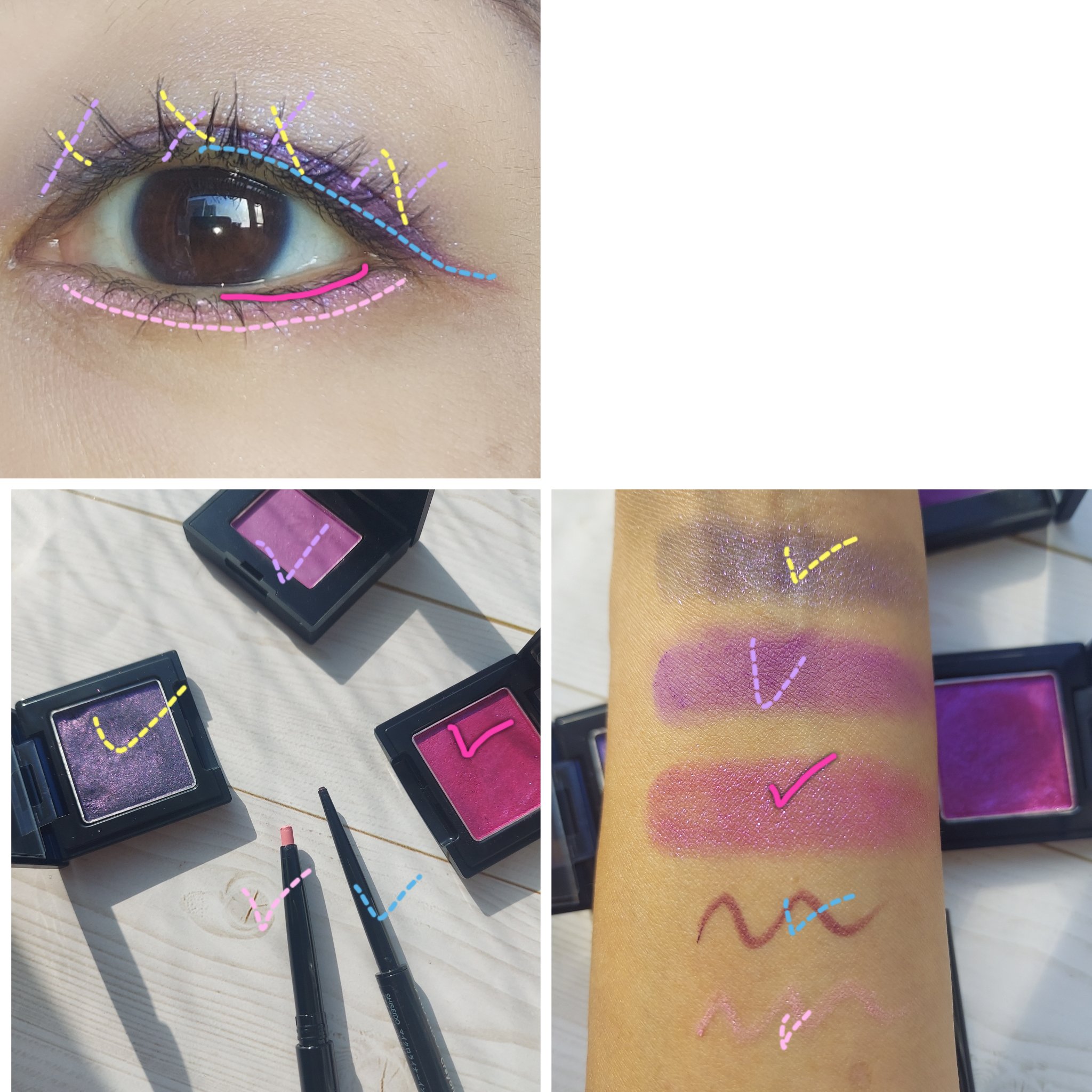 シャネルのホリデーかわいいなぁ、と手持ちで似た色を探してメイクしてみました。 手持ちで紫とピンクを。 ただの派手なメイクになっただけでしたが、好きな色ばっかりなのでメイクするのは楽しかった。 マットな紫は #NARS #シングルアイシャドー #5357sultan です。