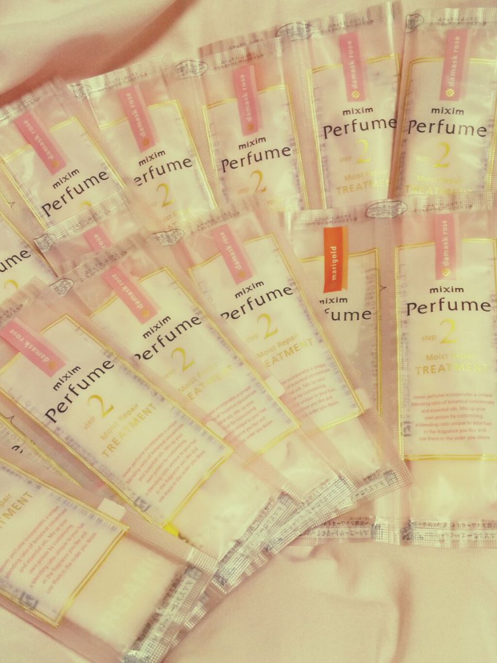 ご紹介する商品はこちらです。『ミクシムパフュームモイストリペアシャンプー・トリートメント』うるサラタイプマリーゴールド+カモミールの香りダマスクローズ+ベリーの香りお安くなってたので、大量購入しました!!その日の気分でシャンプートリートメントを変えたい私には、1日お試し用は重宝してます✨✨仕上がりが良かったものが安くなってるとつい大量に買ってしまいます(笑)ミクシムパフュームはパケが可愛いですよね☺️パケも良し✨仕上がりも良しの商品でした。香りもとってもいい香りなんですよ~香りフェチの私にはたまりません(*´д`*)♥️シャンプーはトゥルトゥルとはいかず、でしたが、トリートメントでトゥルトゥル実感✨✨ドライヤー後は髪の毛しっとり。まとまりもあって、髪のツヤもでてくれました!!翌朝、毛先までしっかりまとまってて毛先ハネてない!!✨✨めっちゃいい(*´д`*)しかもツヤもそのまま!!リピ確定商品です☺️♥️