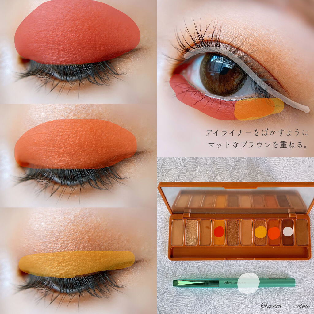 ワントーンメイク🍂🍁目元もチークもリップも色味を合わせたワントーンメイク、1度やってみたかったんです☺️💓どんなカラーがいいかな?っていろいろ考えたのですがなんだかんだ1番好きで、1番似合うであろうオレンジブラウンを基調にしました!なので今更ですが秋感満載です🤪🍠🍂🍁(ULIKEってロゴ消えないんだね🤣🤣めちゃくちゃ写ってる🤣🤣)▽▲メイクプロセス▲▽◎アイメイク1.マットなイエローブラウンをふんわりとしたブラシでアイホール全体と下まぶた全体的に塗る。2.同じブラシにマットなオレンジブラウンをとり、二重幅少し上まで塗る。3.シマーなブラウンを平筆にとり、二重幅辺りと、下まぶたの目じり側に塗る。4.ブラウンのアイライナーで目尻ラインとインラインを引く。5.そのラインをぼかすようように、マットなブラウンで少しボカす。6.ビューラーでまつ毛をあげ、ティッシュオフした黒のマスカラを塗ってアイメイク完成!◎チーク編1.BE03をふんわりとしたチークブラシにとり、頬骨に沿って塗る。2.上からOR04を重ねても完成。◎リップ編1.無敵テラコッタを唇全体に軽く塗る。2.その上からたっぷりアップルオレンジを塗って完成。あとはシェーディングを軽くして、ハイライトをしています🙋♀️💕マスカラもブラウンを使おうかと思ったのですが、ぼやぼやし過ぎそうだったので、マスカラはあえてブラックを使いました😚✌️画像に載せ忘れているんですが、ファシオのパワフルカールマスカラEXロングを使ってます!カラコンもオレンジブラウン系のLILYANNAのSarangBrownを使いました😚✌️少しでも参考になれば幸いです!では最後までお読み頂き、ありがとうございました🙇♀️💓#ワントーンメイク#オレンジブラウンメイク#メイクプロセス#peachのアイメイク