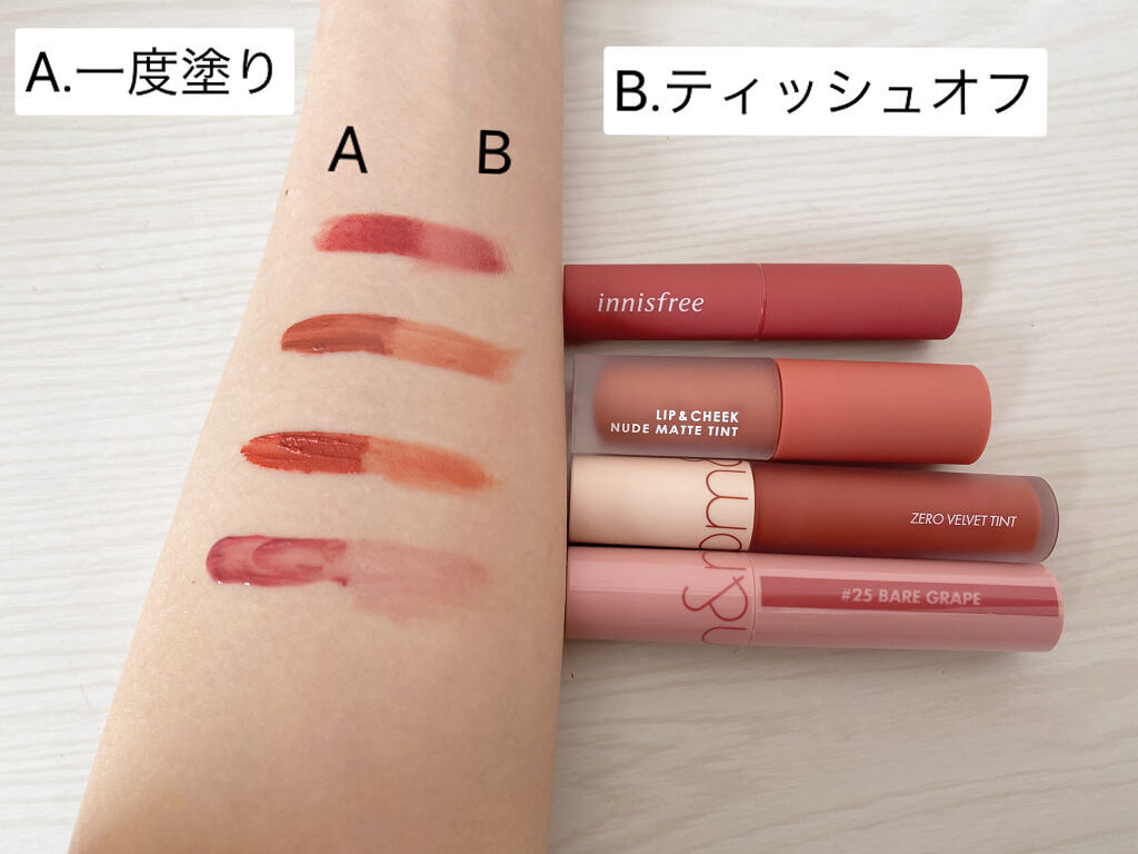 厳選!お気に入りリップ4選❤️昨年の12月頃から、マスク生活ですが毎回メイクや洋服に合うリップを必ず塗るようになりました!マスク生活だからこそ、それまでよりリップにこだわるように!私がリップに求めるもの*マスクにつきにくい*色が落ちにくい*発色が綺麗これらの条件を満たしたお気に入りのリップをご紹介します(^ν^)*前置きがだいぶ長くなってしまいました。すみません🙇♀️①rom&nd ゼロベルベットティント #17TOASTYNUDEナチュラルなマットティントリップです。ベースとしてもかわいいし、これ一本でもナチュラルに可愛くなれるモテリップ🥰ティッシュオフしたり、綿棒で塗るとマスクにつきにくいです。②rom&nd ジューシーラスティングティント #25 baregrape こちらも薄付きカラー 色落ちしないし、マスクにもつきにくい ブルベ夏にオススメな青みピンク③CathyDoll リップアンドチークヌードマットティント 05 SoftlyPeach 質感は、ふわふわなマット😳 べったりというよりふわふわ! (↑語彙皆無) 色は、ピンクベージュカラー! めっちゃかわいい発色です😍 この質感でこの色が欲しかった!っと 使って感動しました🥺 イエベ春の方にオススメです♪ *マスクにはつきやすいです。 ティッシュオフなのど色々と工夫してみてる のですが、つきやすいです! つきにくくできるよう研究中です。④innisfree ビビッドコットンスティック 4番 レッドビーンピンク 口紅のようなパキッとした高発色ですが、 マットティントなので、マスクにつきにくく お気に入りです♪ スティックタイプは、塗りやすくお直しに便利なので、重宝してます!なにか、気になるリップがあれば嬉しいです😆 最後まで読んで頂きありがとうございました😊#オススメコスメ#お気に入り#韓国コスメ#韓国リップ#リップティント#マットリップティント#ロムアンド#rom&nd#ジューシーラスティングティント#ゼロベルベットティント#イニスフリー#innisfree#ビビッドコットンスティック#cathydoll#リップアンドチークヌードマットティント#リピアイテム#1軍アイテム#バレンタインメイク#ドラコス最強コスメ