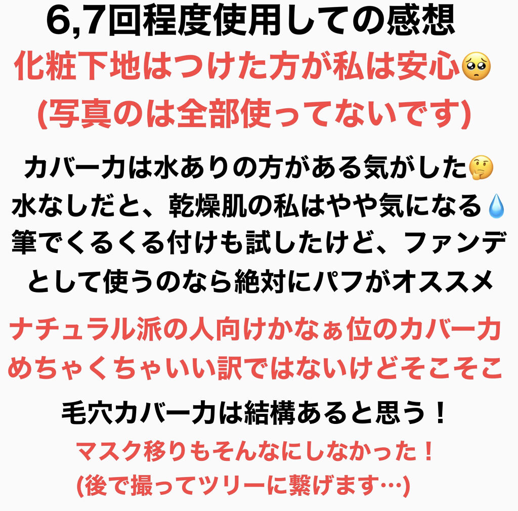 #FASIO様より#提供ガチレビュー企画の商品です。Twitterでは呟きましたがこちらでも。カラーはベージュオークルです。色味に関しては私には少し黄味が強く暗めに感じたので参考にしないでください🙏下地なしでOKのファンデーションです🥰2枚目でカバー力の程は分かるかと思います。下地なしでもここまでカバーできました。写真はmeituの肌補正0、フィルターはオリジナルを使用しています(無加工)めちゃくちゃカバーできる!って程ではないですが下地なしだとこんな感じです。3枚目は水ありと水なしの比較です。水ありの方が肌に綺麗に密着している感覚がありました。なので私は水ありの方が好きかな。そして崩れはちょっと脂浮いたのと鼻周りが微妙に崩れてるかな位で、大した崩れはありませんでした。参考までに私の肌は乾燥肌気味ですツールに関しては、パフの方がいいです。筆でやってみましたがノリが悪かった…。個人的にはですがやっぱり下地つけた方が安心だなーって感じです。カバー力も崩れも悪くない感じ🙆🏻♀️星5中で言うと3以上、ガチレビューでした🙇♀️