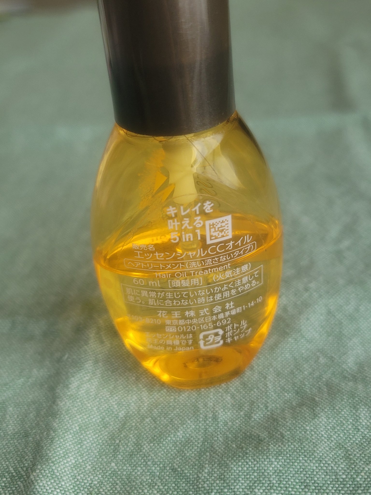 キレイを叶える5in1(髪ダメージ補修&予防・ツヤ髪効果・ドライヤー速乾・翌朝まとまりUP・アイロンするんときまる) 摘みたての花果実ふわり広がるフローラルブーケの香り、強い香りじゃないけど爽やかな香り◎ サラッとしたオイル。私は肩につかないくらいの切りっぱなしボブだから2プッシュ使ったよ。