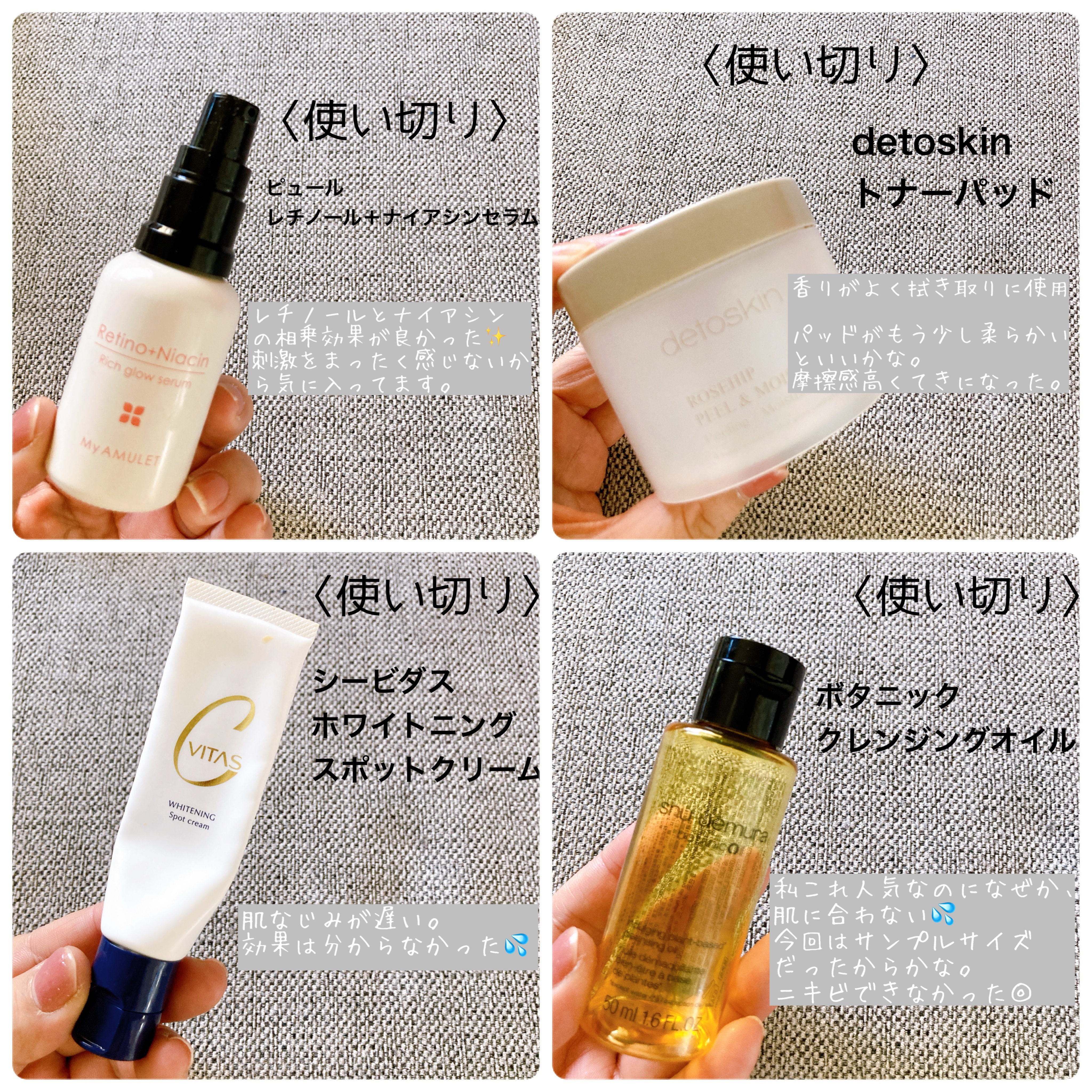 1月使い切り〈断捨離〉・aerosollotionレモンパフソーダ使いにくくて断捨離💦スプレーするとパフ上になる化粧水だけどそのパフがポロポロして使い勝手悪かった😅・クレシェソワスリーピングムースマスクこれは肌に合わず断捨離私はヒリヒリして合わなかったです。洗い流さず馴染ませるんだけど結構ベタつきが強かった。〈使い切り〉・detoskinトナーパッド・ピュールレチノール+ナイアシンセラム・ドゥーエ乳液・メトラッセモイストチャージフィックス・アンレーベルモイストボタニカルミセラークレンジング・シービダスホワイトニングスポットクリーム・Amelieグロウフェイスマスク・ジョイココスクラブハンドソープ・イネスジェントルスクラブクレンズ・ケラスターゼセラムシカプラズム・シュウウエムラボタニッククレンジングオイル・マックミネラライズアイシャドウピンクセンシビリティーズ〈サンプル使い切り〉・エトボスアイクリームこってり濃厚で小じわに良かった・明色化粧品シワ、美白クリーム目元に使用してたけどこれはよかった!まぶたのシワシワがなくなった◎・primeraウォータリークリームぬるく伸びが良いさっぱり系クリームでベタつきがなく香りも良かった。・AVEDAヘアトリートメント1回分だったからよくわからない笑┈┈┈┈┈┈┈┈┈┈#使い切り#使い切りデパコス#使い切りスキンケア#使い切りコスメ#DETOSKIN#2e#unlabel#ケラスターゼ#ボタニッククレンジングオイル#ミネラライズアイシャドウ#ピンクセンシビリティーズ#Amelie#ジョイココ#ines#ジェントルスクラブクレンズ#METLLASSE#メトラッセ