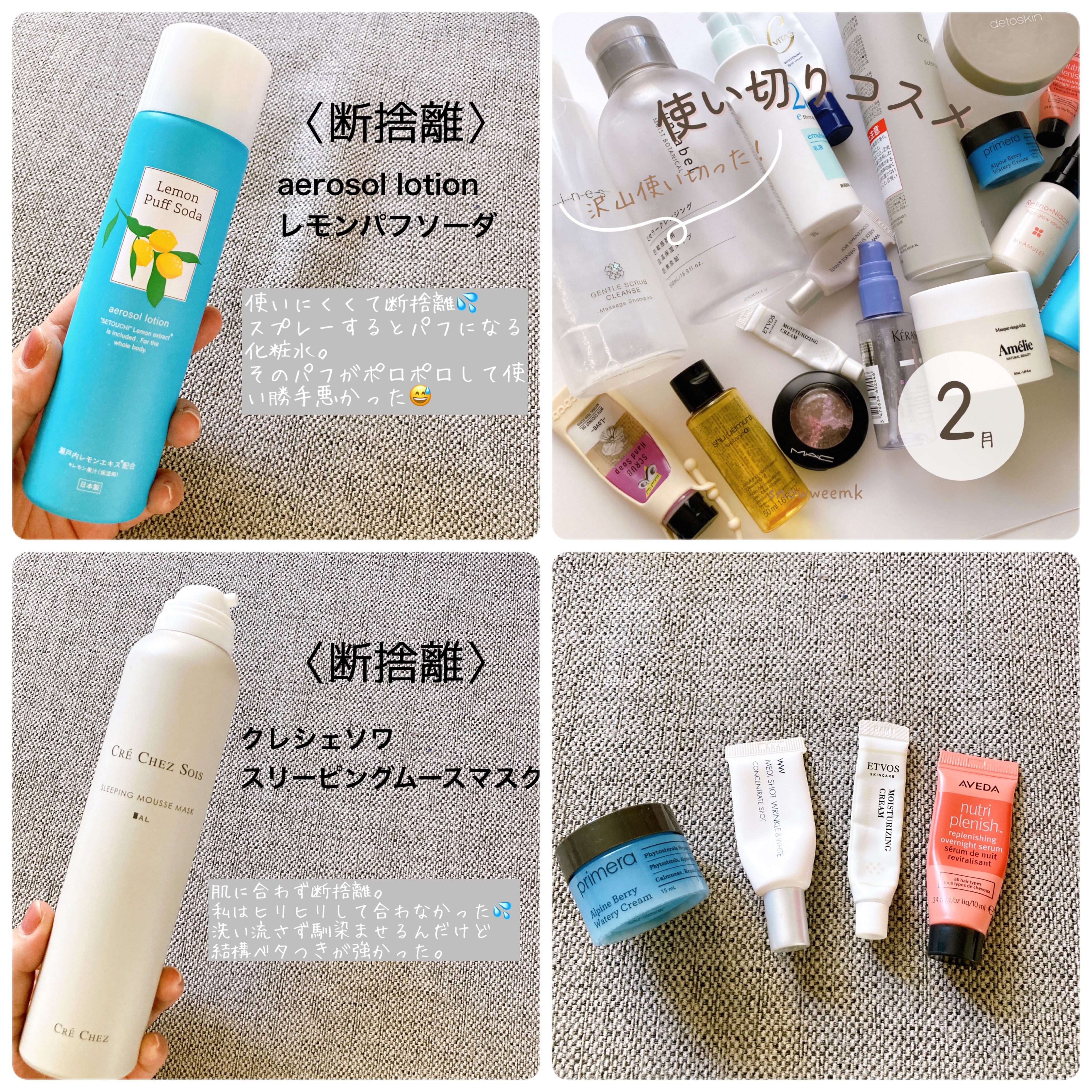 1月使い切り〈断捨離〉・aerosollotionレモンパフソーダ使いにくくて断捨離💦スプレーするとパフ上になる化粧水だけどそのパフがポロポロして使い勝手悪かった😅・クレシェソワスリーピングムースマスクこれは肌に合わず断捨離私はヒリヒリして合...