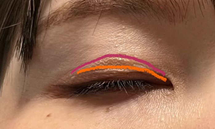 写真を綺麗に編集する気力はないけど、久々に投稿します。がっつり奥二重の私は、どうしてもアイラインを引いても目を開けたら見えなくなるのに納得ができなかったのです。目つき悪いし。・アイプチ→目を閉じると不自然な上に瞼伸びる・メザイク→高いし、時間経つとのりがネトネトする・アイテープ(片面)→テカる・アイテープ(両面)→目を瞑ると不自然の極み、瞼伸びる・伸びるアイテープ→目開いても閉じてもつっぱってる感ある・皮膜タイプのり→奥二重の元々の線がとにかく邪魔をしてくる、固まった皮膜がまつげに被さってきて何か塗ってる?付いてる?感が出る世の中には上手に使ってる人がいる事は重々承知なのです。しかし私の二重では満足できませんでした!!🥹メッシュアイテープに出会って、なんか惜しいの感覚が消えず。というのも、一番細いのは論外に力不足で、楕円だと幅がちょっと足りなくて元の二重の線が出張ってきて三重のようになってしまうけど、半月だと太すぎて目尻側に貼っても目頭側にメッシュが出てきて貼ってます!!感が出ちゃってたんです。消去法で楕円を使ってアイシャドウで誤魔化されるといいな⭐️という気持ちでいました🥹でも、ある日気付いたんです。(大袈裟)半月だと、元の二重の線はメッシュで抑えられて出てこないんだから、半月の目頭側を切ればいいのでは???と。でも毎日目頭側だけ切るのめんど。一番幅欲しいところがある状態で元の二重の線が抑えられる方法ないのか。半分にして、ちょい足りない部分を皮膜タイプのりで補えば取れにくくもなるし一石二鳥なんじゃないか???と。これが一番しっくりきました。※目の幅や、二重の幅や、器用さなどで人それぞれだと思うので、あくまで私は一番良かった方法です。全てのアイメイクを完了させてからスタート!①半月を真っ二つに切ります。②ピンセットで取って、スプレーする③黒目の中央より気持ち目頭よりの所に太い方、目尻側に細い方が来るように貼る④オレンジの線が元の二重の線でピンクの線がテープで作った線⑤テープの端を皮膜式のりで止める 元の線が出張ってる箇所があったら塗っとく⑥乾くの待つ🔚半分に切ってるので、右左間違えると逆になるのは気をつけて欲しいけど、毎日やってると息をするように出来ます笑これでようやく目を開いても違和感なく目を閉じてもそこまで目立たず、許せるラインに達しました!👏皮膜式のりは一応マットなものを使うようにしてます。端しか塗らないので、何使ってもあんまり変わらないかもしれませんが笑もし同じことを悩んでる方がいたら、良かったらやってみて下さい🙇♀️