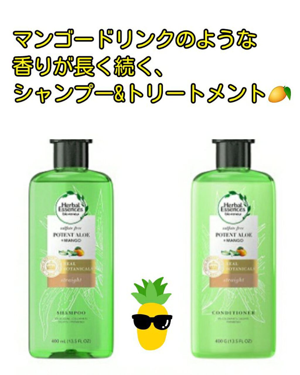 ハーバルエッセンスビオリニューアロエ&マンゴーシャンプー/コンディショナーアロエベラたっぷりの、プルプルシャンプー☺️香りは1000%マンゴー!外国っぽいです✨成分は優しめなのに泡立ちはしっかりで、地肌まですっきり洗えます。ハーバルエッセンスのシャンプーは全体的に流す時に非常にきしみますが、トリートメントを使えばするするになります☺️うねり対策シャンプーですが、効果は同じハーバルエッセンスのココナッツの方が上です。でも安全性が高いのはマンゴーなので、私がよりオススメ出来るのはこちらです。私はシャンプーの香りが残りにくく、香りを売りにしてるアイテムを使っても、本当に嫌なんだけど頭皮臭がすんごいんですが、こちらはマンゴーの香りがきちんと残ってて嬉しい…。気分は南国🌴だってシャンプーはマンゴー、ボディバターもマンゴー、日焼けどめはマンゴーとココナッツだから!!