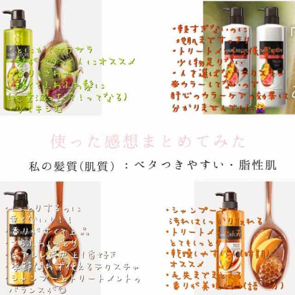 🎀永久保存版🎀全て使った上で、私なりの使用感をまとめてみました✨.̩₊̣.̩✧*̣̩˚̣̣⁺̣‧.₊̣̇.‧⁺̣˚̣̣*̣̩⋆̩·̩̩.̩̥·̩̩⋆̩*̣̩˚̣̣⁺̣‧.₊̣̇.‧⁺̣˚̣̣*̣̩✧·.̩₊̣.̩‧1番のおすすめは🥝キウイエンパワーボリュームレシピ🥝とにかくサラサラふわふわに仕上がる✩⃛髪の毛減った?!ってくらい髪が落ち着いてくれます。なのに根元からふんわり髪に...❤︎暑さや湿気で髪がベタつくこの時期にとーってもオススメ😊👏💕.̩₊̣.̩✧*̣̩˚̣̣⁺̣‧.₊̣̇.‧⁺̣˚̣̣*̣̩⋆̩·̩̩.̩̥·̩̩⋆̩*̣̩˚̣̣⁺̣‧.₊̣̇.‧⁺̣˚̣̣*̣̩✧·.̩₊̣.̩‧パッケージや香り、成分にもかなりこだわっているヘアレシピシリーズ🍊🍨🥝🍯それぞれ全然違ったコンセプトとテクスチャなので迷いますよね😣💦.̩₊̣.̩✧*̣̩˚̣̣⁺̣‧.₊̣̇.‧⁺̣˚̣̣*̣̩⋆̩·̩̩.̩̥·̩̩⋆̩*̣̩˚̣̣⁺̣‧.₊̣̇.‧⁺̣˚̣̣*̣̩✧·.̩₊̣.̩‧どのシリーズもシャンプーはしっかり汚れを落としてくれます。トリートメントの重みや保湿効果がかなり異なるのでそこがポイント⭐️使用感から言うと「しっかり汚れを落として、しっかり保湿・補修をする」という感じでした🤗❣️みなさん美髮になりましょう✨.̩₊̣.̩✧*̣̩˚̣̣⁺̣‧.₊̣̇.‧⁺̣˚̣̣*̣̩⋆̩·̩̩.̩̥·̩̩⋆̩*̣̩˚̣̣⁺̣‧.₊̣̇.‧⁺̣˚̣̣*̣̩✧·.̩₊̣.̩‧※比較用の画像は公式サイトから引用させていただいています。#COSMEMO🤤