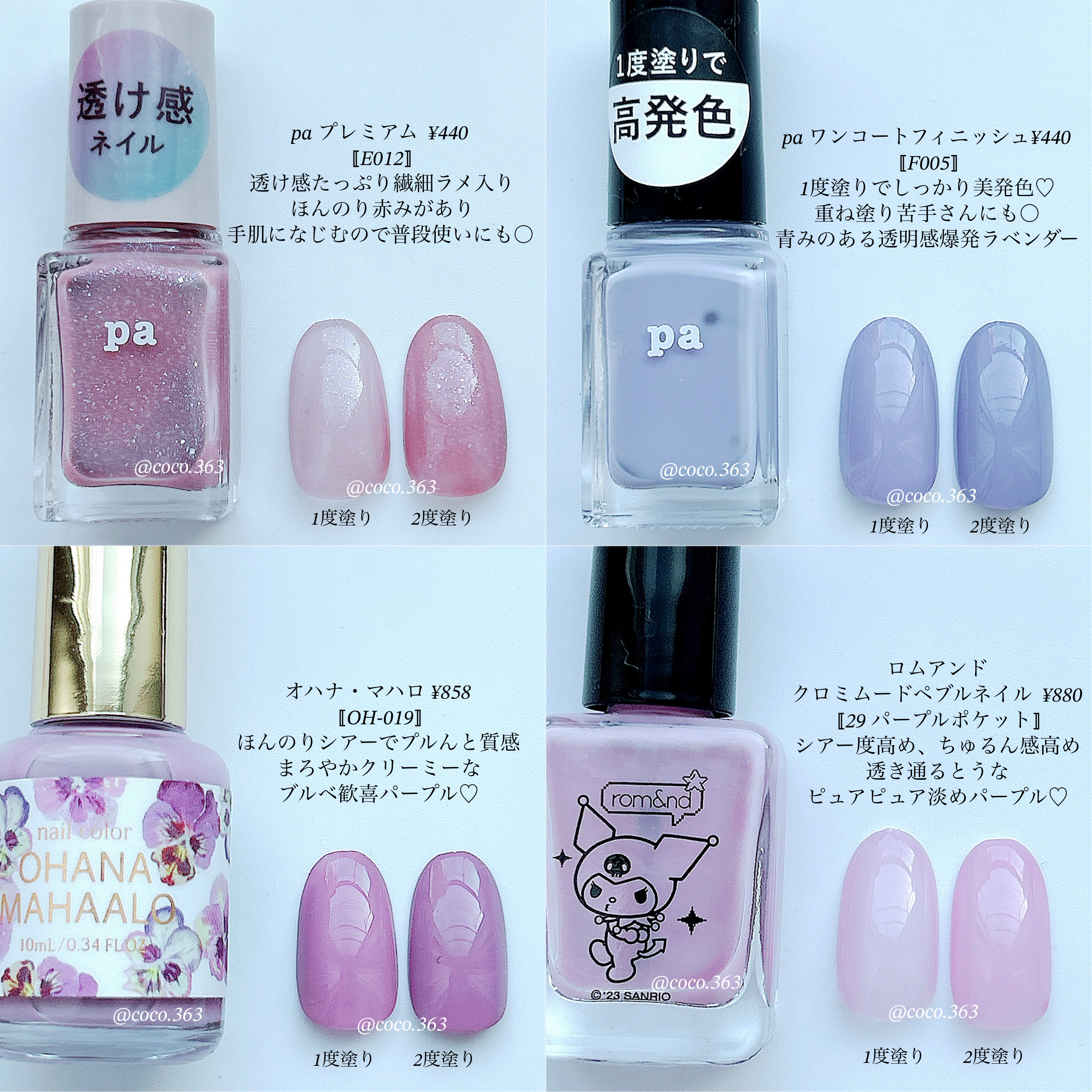 全部プチプラマニキュア💅🏻爪先に盛れる透明感♡儚げ、華奢みえな淡め・ラメパープル8選💜︎︎︎︎︎︎☑︎詳細は2枚目からの画像でどうぞDフレンドネイル(キャンドゥ)¥220〚ソフトラベンダー〛・フレンドネイル様より提供キャンメイクカラフルネイルズ¥396〚N96あまやどり〛〚N102カラーデニム〛ネイルホリック¥396〚PU163〛paネイルカラープレミアム¥440〚E012〛・DearLaura様より提供paネイルカラーワンコートフィニッシュ¥440〚F005〛・DearLaura様より提供オハナ・マハロネイルカラー¥858〚OH-019〛・DearLaura様より提供ロムアンドクロミムードペブルネイル¥880〚29パープルポケット〛ロムアンドのクロミネイルはキャンメイクファンデーションカラーズの〚02ラベンダーピンク〛に近いカラーだと思います🫶🏻お買い物の参考になればうれしいです🥹🤍ネイルのまとめは↓↓↓からどうぞ!#coco100円ネイル#cocoキャンメイクネイル#cocoNAILHOLIC#cocopaネイル#cocoロムアンドネイル#cocoオハナマハロネイル#フレンドネイル#キャンメイク#キャンメイクカラフルネイルズ#キャンメイクネイル#ネイルホリック#paネイル#オハナマハロ#ロムアンド#ロムアンドネイル#夏ネイル#簡単ネイル#ワンカラーネイル#パープルネイル#紫ネイル#ちゅるんネイル#シアーネイル#ラメネイル#透明感ネイル#プチプラコスメ#プチプラネイル#韓国コスメ#韓国ネイル#セルフネイル#ネイル#ポリッシュ#ネイルポリッシュ#マニキュア#selfnail#nail#美甲#네일#ご機嫌夏ネイル#垢抜ける方法#垢抜ける#垢抜けアイテム