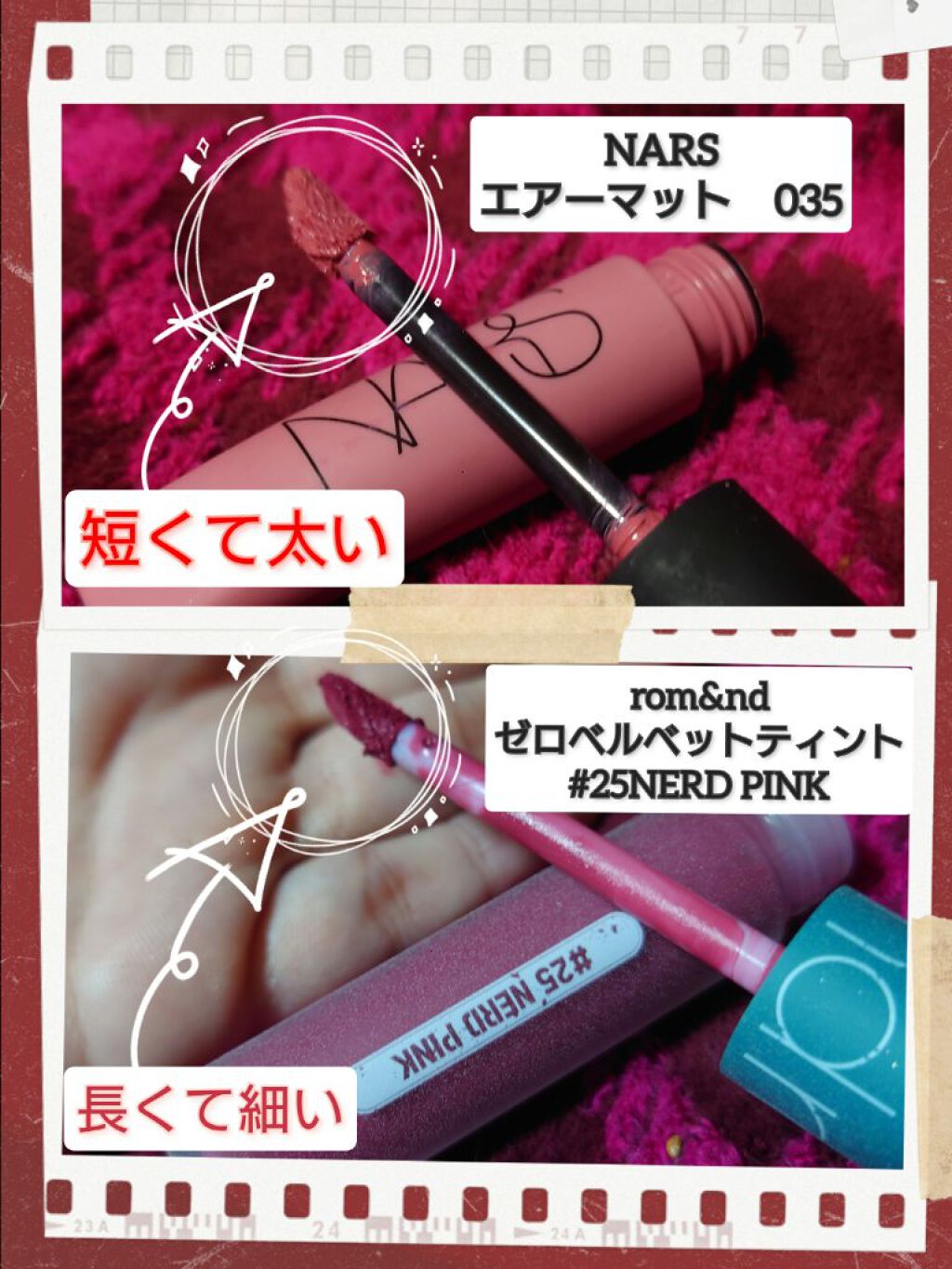 春らしいピンクのマットリップ♡NARSエアリーマット リップカラー035肌馴染みのいいピンクブラシは短くて太めの斜めカット塗り心地はふわふわ乾燥しにくいrom&ndゼロベルベットティント #25NERDPINKrom&ndが少し濃いピンクでブラシが斜めカットで細く長めほわほわした雲みたいな質感!乾燥しにくいです!これだけ塗っても、もちろん可愛いけど私は、これを全体に塗ってから上にNARSを重ねます!そうすると絶妙な春っぽい柔らかくて透明感がある感じのピンクになりほんとに可愛い…!!グラデーションもしやすいので自分好みに、調整しやすいです!ただティッシュオフしてもとれやすいかなと個人的には感じました…色が可愛い分、そこが残念…