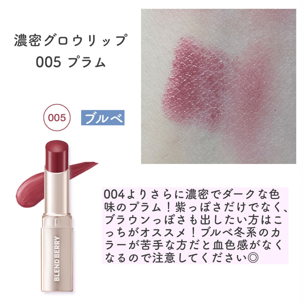 \色味が可愛すぎるガチ推しリップ/濃密でとろけるような塗り心地の透明感パール💓こんにちは!アフリカ少女です🐘(プロフィールに私の名前を書いてくださっている方はフォロバしますので、コメントで教えてください❤︎)🌟こんな方にオススメ🌟☑︎お洒落な色味のプチプラリップを探してる!☑︎透明感のあるツヤ感リップが大好き!☑︎ちゅるんとあざといオレンジリップが欲しい!☑︎大人っぽいセクシーなベリーカラーが好み!*:.,.:*:.,.:*:.,.:*:.,.:*:.,.:*:.,.:*:.,.:*:.,.:*:.,.:*:.,.:*:.,.:*今回ご紹介するのは…✔️BLENDBERRYブレンドベリー濃密グロウリップ→1650円です‼️評価:10点満点中【10点】購入可能場所:ロフト、プラザなど今回は最近のお気に入りブランド、BLENDBERRYのリップを全色ご紹介します!!これ、本当に大好きで、久しぶりに10点満点評価にさせていただきました😍😍とろけるような濃密質感と、透明感の出るパールによるツヤ感が本当に綺麗だし…何より色味がお洒落で、ちょっと個性的で本当に可愛いんです!!マスクメイクだからあんまりツヤツヤなリップって使いづらいじゃないですか💦でもこういうパール入りのものなら、実際の水分量以上に光を反射してぷっくり見せてくれるので、最高です✨ブルベ/イエベさんどっちでも嬉しいカラー展開なので、ぜひお気に入りのカラーを見つけてみてください!!<001ラズベリー>清楚な印象の王道レッドカラー!黄みが強めな赤なので、ちょっとトマトケチャップみたいな感じ◎パキッとしてなくて肌馴染みがとてもいいので、赤リップ初心者さんやナチュラルメイクにも!<002ほおずき>ちゅるんとあざといオレンジリップ!優しいナチュラルなカラーなので、どんなメイクにも似合います!ぷるっぷるな赤ちゃん唇に見せてくれるので、イエベさんは持っておくと本当に重宝します!<003チェリー>少し大人っぽさを感じられつつアイドルみたいな可愛さもある、超可愛いピンクリップ!これを塗るだけで色が白く見えるので、儚げ透明感メイクに憧れている方は、ぜひ使って欲しいです!<004ペッパーベリー>大人のセクシーリップ代表、お洒落すぎるベリーカラー!ちゃんと紫色なのに全然血色が悪くならないし、肌馴染みも良いんです◎いつもより大人っぽく、イメチェンしたい時にもオススメです!<005プラム>004よりさらに濃密でダークな色味のプラム!紫っぽさだけでなく、ブラウンっぽさも出したい方はこっちがオススメ!ブルベ冬系のカラーが苦手な方だと血色感がなくなるので注意してください◎<006ブラウニーベリー>ブラウンすぎず使いやすいブラウンリップ!これからの夏の終わりから秋にかけて備えておきたいカラー!意外と青みもあって、わたしの肌だと少しピンクグレーっぽくもなるので、ブルベさんでも◎*:.,.:*:.,.:*:.,.:*:.,.:*:.,.:*:.,.:*:.,.:*:.,.:*:.,.:*:.,.:*:.,.:*最後まで見てくれてありがとうございました〜🥰後で見返したい!と思った方はクリップ📎してみてください🌸《Instagram》良かったらフォローお願いします♪💌インスタのDMで、恋愛/メイク/スキンケアの相談に乗ってます💌@africa_onnanokoです🐘《チャット》よかったら参加してみてください❤︎アフリカ少女お悩み相談室↓https://lipscosme.com/chats/1ブルベ冬さんのお部屋↓https://lipscosme.com/chats/21共感した!参考になった!面白かった!という方は、いいね❤️、クリップ📎、フォロー👤、お願いします☺️ウォッチや通知もぜひオンにしてみてください☀️#プチプラコスメ#プチプラメイク#透明感コスメ#透明感メイク#儚げコスメ#儚げメイク#スクールメイク#モテメイク#モテコスメ#ピンクメイク#ピンクコスメ#ナチュラルメイク#中学生#高校生#小学生#大学生#新作コスメ#限定コスメ#夏のマストバイ#落ちないリップ選手権