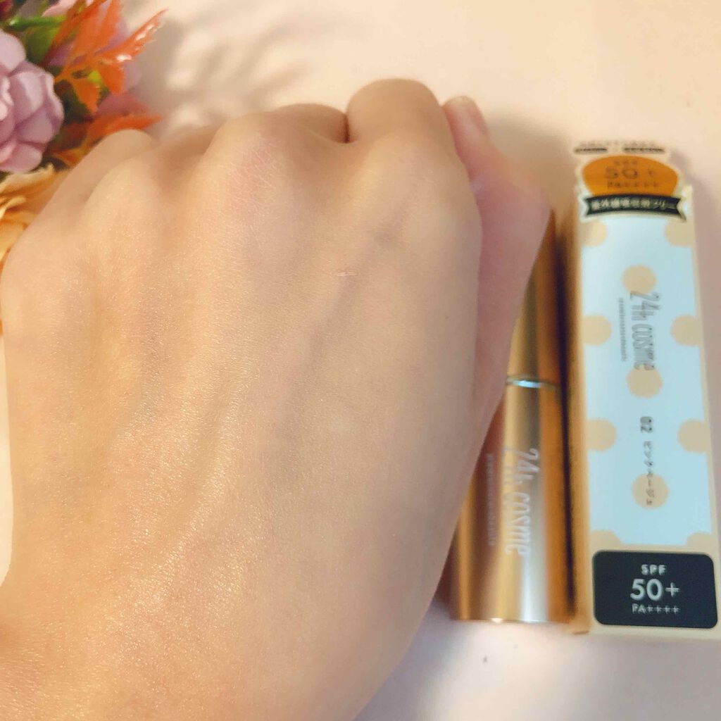 メイクして外出した時、やっぱりメイクが崩れちゃわないかどうかとか、..また、ナチュラルメイクが好きなので、素肌感のあるファンデーションというのはとても気になるところです(*‘ω‘*)..そんな中今回、24hCosme様の・「24 ミネラルペアリングベース」・「24 ミネラルモイストスティックファンデ」を試してみました(*´艸`)..まず、「24 ミネラルペアリングベース」<化粧下地>「必ずよく振って」から、適量を手に取り、顔全体にむらなく伸ばしていきます♪..で、そのあと、「24 ミネラルモイストスティックファンデ」<ファンデーション>を塗っていきます。..① まずはTゾーンから あご、頬の順に軽く滑らせていきます。 ↓② 人差し指、中指、薬指の3本の指を使って、顔の中心から外側へ 手早く伸ばしていきます。 ※ポイント 目の周りや、小鼻・口元はできるだけ薄く伸ばします ↓③ 最後にきれいなスポンジで軽くたたきながら馴染ませていきます♪..やはり、同じ会社の商品という事だけあって、下地とファンデの相性がよく、メイクが長持ちしますね(*´艸`)..ファンデも使いやすい口紅型の設計で、とてもおしゃれなので、外出する際のお出かけ時にも便利で使いやすいアイテムだと思います♪..気になった方は、是非チェックしてみてください(*´艸`)..#24hcosmeモニターレビュー#24hコスメ#24ミネラルペアリングベース#24モイストスティックファンデ#ナチュラルメイク#ベースメイク#化粧下地#石鹸オフ#低刺激#敏感肌#美容好き#コスメ好きな方と繋がりたい