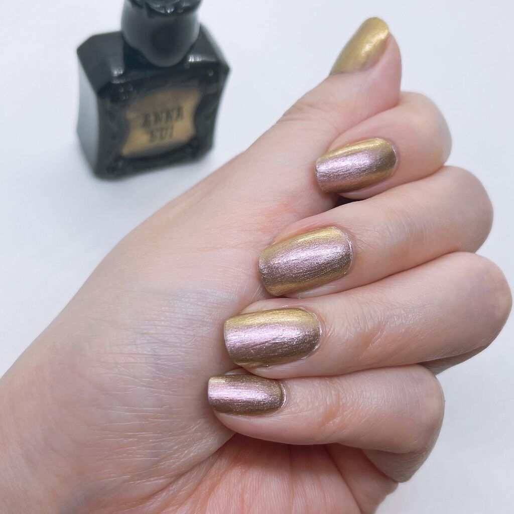 できれば画像全部見て欲しい偏光ピンクゴールド▼#ANNASUIネイルカラー701なんか塗っておきたいけどぱぱっと済ませたい時に出番が多い701これ本当に色が伝わりにくいけど、ピンクゴールドでもあるしメタリックベージュでもあるし、偏光とギラっと感が見てる時より写真になると反射するから写しにくい。案外ピンク感強めです。ひとつ前に動画で上げてるけど本当伝わってくれの気持ちで写真も含めてもう少し詳しく。いろんな角度から光当てて撮ってみたのでちょっとは分かりやすいと思います。全部薄めに2度塗りです昔からANNASUIにある色で割と代表的なカラーでもあるけど現行パケになってからの品番は7011度塗りだと透け感あるから案外ナチュラル。色が1番近いのはハケだけの色かなぁ。本当角度によって変わるからこれ!って言えないけど、スフィンクスに似てる。で、鳥サンクの時に出てたディオールの限定ゴールドとも似てる。ディオールのほうがもうちょい明るめでメタリック感は落ち着いてて偏光感強かった印象。何も考えずに塗れて、塗ったら爪キラッとするので、疲れてるけどテンション上げたいからなんか塗っときたいなーっていう時にちょうどいい。私の手持ちの中でも圧倒的に持ちがいいのがANNASUIネイルで、これ案外肌に馴染むベージュ系がベースなので先端がちょっと剥げても分かりにくいのもポイント高め。何かイベントごとあるけどそれまでの繋ぎに塗っておくならだいたいこれ。光に当たって1番明るいところはピンクに見えて、ちょっと影になる部分はゴールドに見える。3枚目と最後2枚が分かりやすい。最後2枚に関しては、実際はここまで黄色くはない。もっと統一感あるけど写真だと限界!ペディキュアにも可愛いし、定番でここまでの偏光ピンクゴールドありがたい。ANNASUIというブランドに抵抗無ければ2000円でお釣りくるから、今ならブラウンメインでこれをポイントにしたりするのもいいと思う。ピンクラメを中央に足したり、親指と小指だけ違う色塗ったりとか塗り分けだけでなんか凝ったネイルしてる感出るし、薄いベージュとかピンクにゴールドフレンチっぽくしても可愛い。このハケ塗りやすいからANNASUIネイル、気になってる人には208のうすーい偏光パープルか、この701を最初にオススメする。私がプレゼントであげてる率が高いのは圧倒的に208だけど、208と701もとても合わせやすい。701うすーく塗って208塗ったらめちゃくちゃ綺麗なのです。ということで今の爪記録も兼ねて。明日というか今日の昼間からちまちまちょい凝ったデザインにしたいから落としちゃうけど、案外ANNASUIネイルの色知りたい人多いっぽいのでお裾分け#ネイル#セルフネイル#マニキュア#アナスイ#anna_sui#ネイルカラー#マニキュア#ポリッシュ#アナスイネイル#1軍アイテム