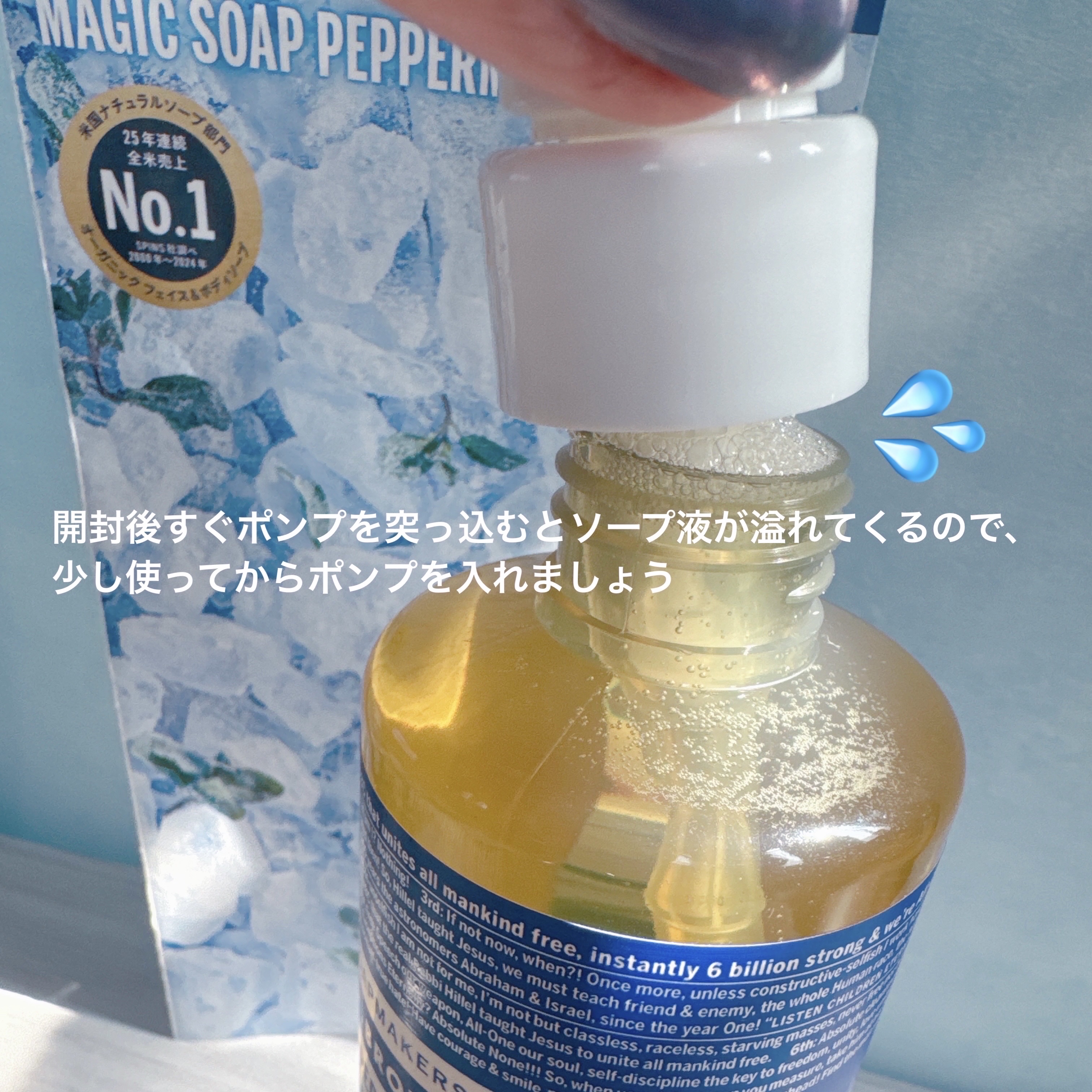 ドクターブロナーのマジックソープペパーミント473mlです。アットコスメで購入しました。サンプルで使ってとてもよかったので現品購入しました!ペパーミントは洗った時にサッパリして涼しく快適に過ごせたので夏に使いました。朝晩で使って1ヶ月くらい持...