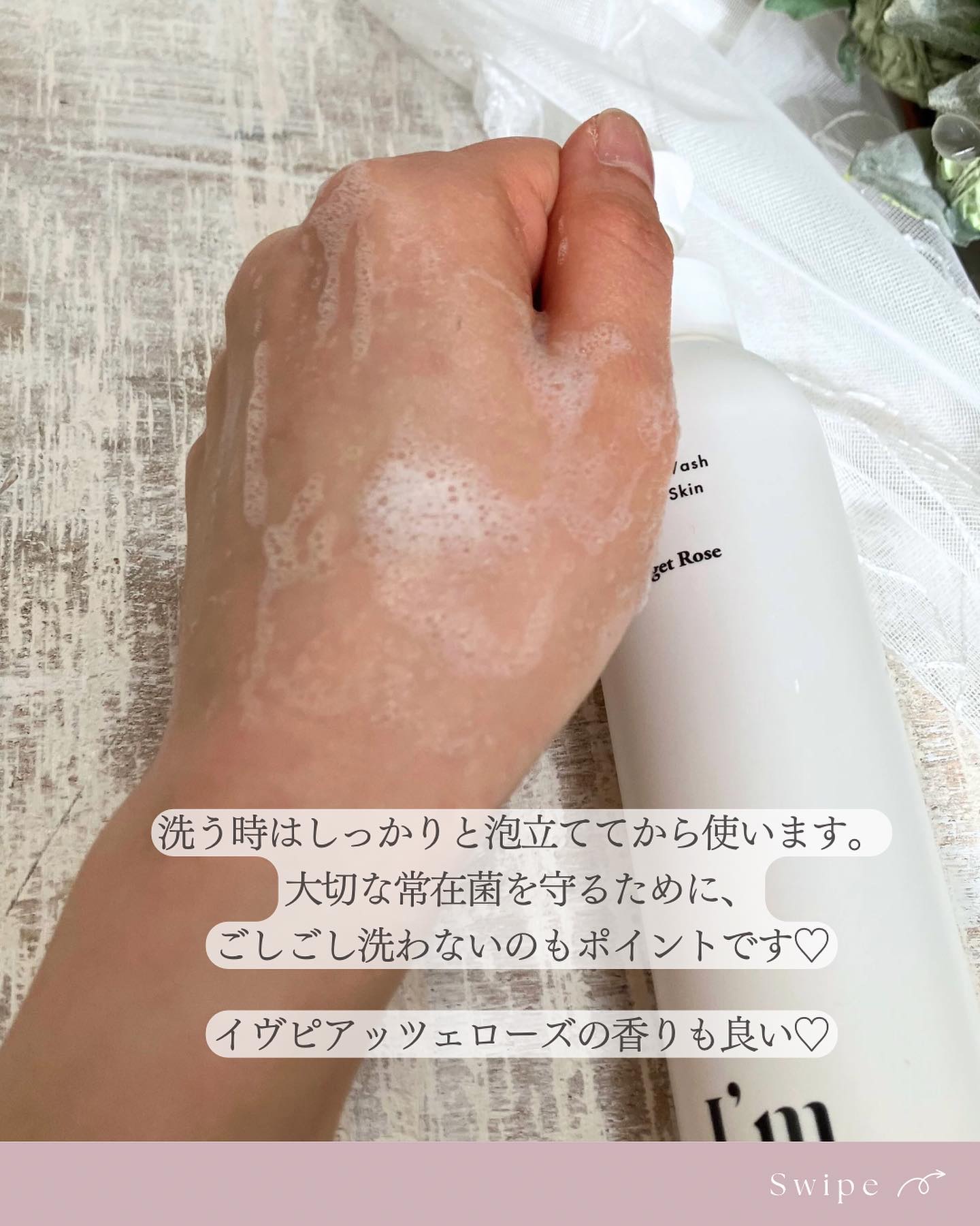 デリケートゾーンは、まぶたよりも薄く、乾燥や摩擦などの刺激に弱く、他の体のパーツよりも、もっと弱酸性な部分☺️ 洗浄力が強いボディーソープで洗うと、しみてしまったり、常在菌のバランスが崩れてしまう原因にも。 I’m のボディウォッシュは、弱酸性で安心して使えるのはもちろん、乳酸菌発酵エキスが配合されていて、潤いのある、ふっくらとした肌に導いてくれる♡ 洗う時はしっかりと泡立ててから使います。 大切な常在菌を守るために、ごしごし洗わないのもポイントです♡ また、洗う場所によってボディはこれ、デリケートはこれ、と使い分けるのも大変だし面倒って思う方もいると思いますが、I’mのボディウォッシュは全身に使えるので、これ1本でOK🥰 イヴピアッツェローズの香りもとても優しくて心地よいです🌹🤍 シンプルなデザインなのも好き♡ バスルームにも自然に馴染んでくれます♡
