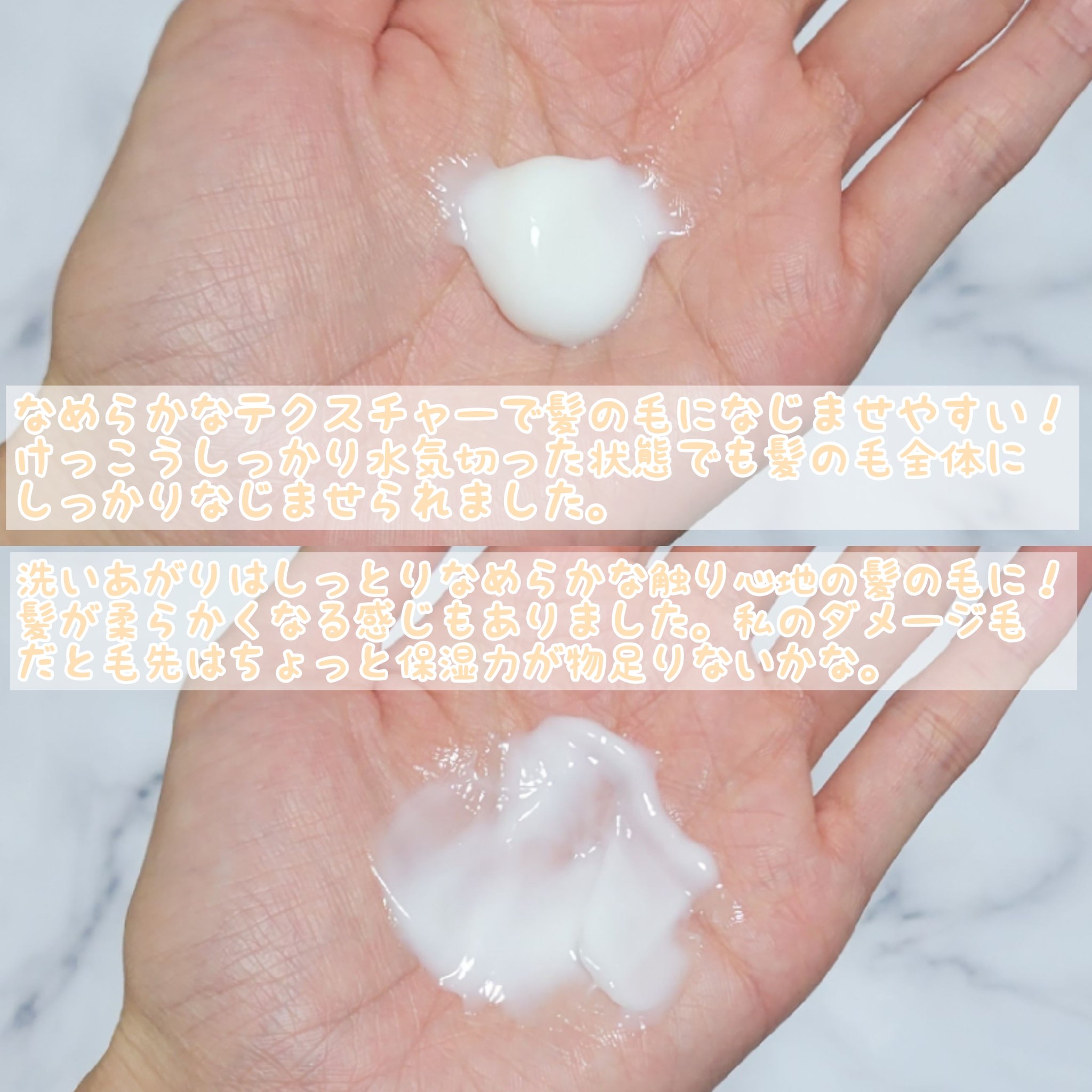 ダメージ毛に嬉しい毛髪保護成分、毛髪補修成分が配合されているトリートメント! なめらかなテクスチャーで髪の毛になじませやすい! 洗いあがりはしっとりなめらかな触り心地の髪の毛に! 個人的にチューブタイプなのが、コンパクトだし衛生的で嬉しいところ。 髪の毛が柔らかくなる感じもありました。 私のハイダメージ毛だと毛先はちょっと保湿力が物足りないかな。