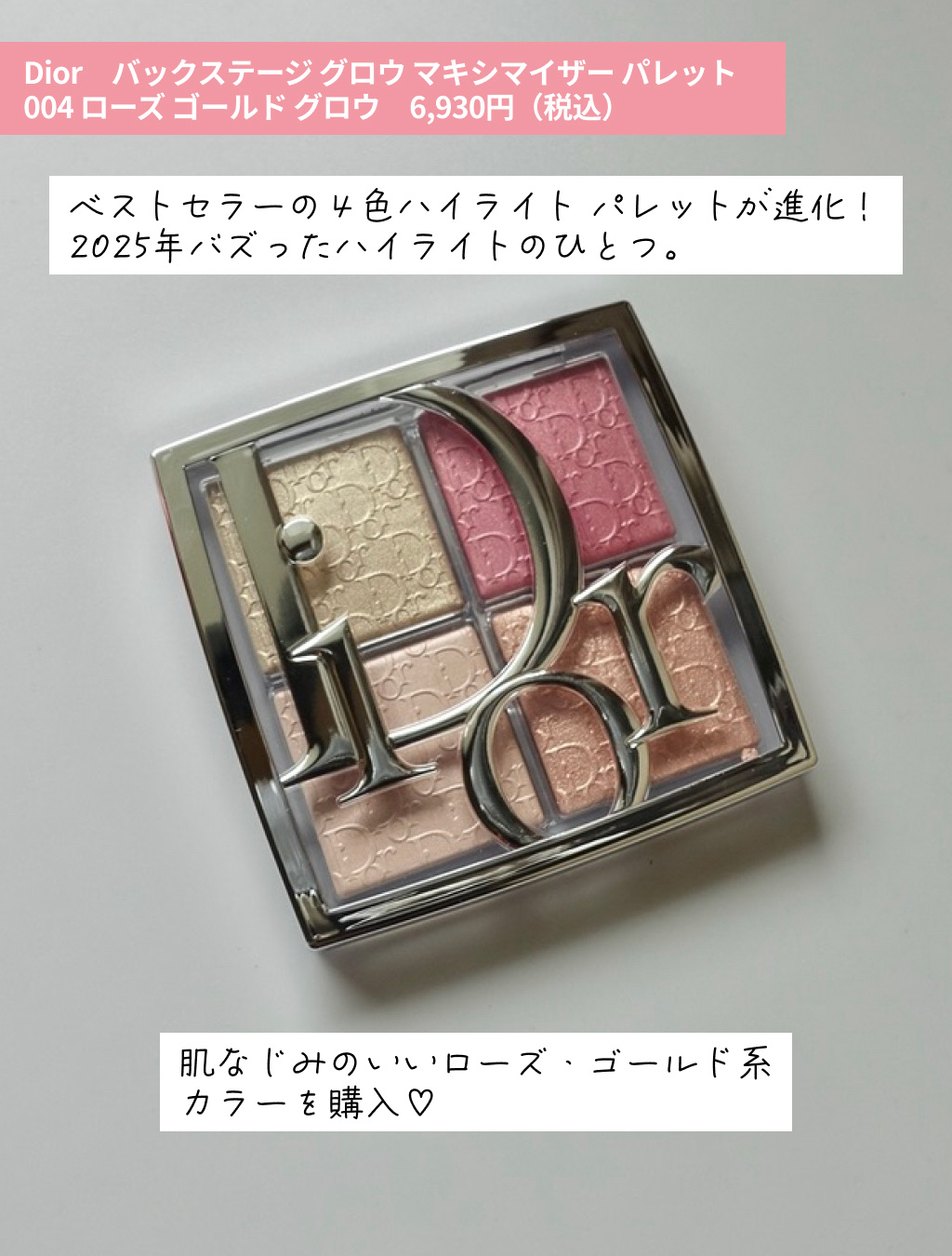 ベストコスメ2025♡Diorのハイライト!リニューアル前からずっと気になっていて、リニューアルをきっかけについに買ったこちらのハイライト。バズってたのはブルベカラーだったけど、わたしは肌なじみのよい004を購入。左下のカラーがとにかく肌なじみがいいので涙袋に使ったり、頬の高い部分に入れたり。本来のハイライト的な使い方も、よくします。他のカラーは結構主張があるのもよくて✨️レモンイエローカラーに、チークにも使える濃いめのピンク、ラメの存在感が華やかなシャンパンカラー。やっぱり買ってよかったなあ!って思えるくらい手に取る回数が多かったハイライトでした。パケがもかわいくて、すき♡▶Diorバックステージグロウマキシマイザーパレット004ローズゴールドグロウ 6,930円(税込)………………………………#ベストコスメ2025#LIPSベスコス使ってみた