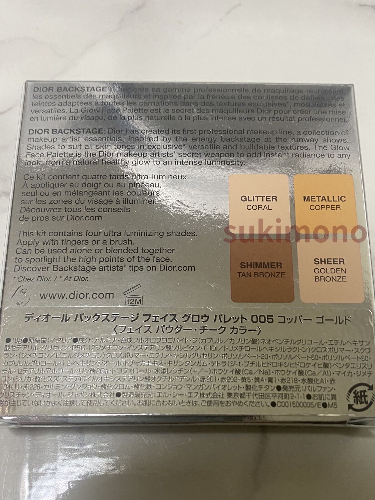 高発色、なのにいやらしさがない上品な色味。 とにかくツヤツヤに頬に乗ります。 これは正直、多少なりともラメ落ちはします。 マスクする前は色もちはめちゃくちゃよかったです。 私が持っている#コッパーゴールド は生産終了しているので現在発売している色としては4種あります。 結構頻繁に使用していて動画に載せた程度にしか減らなかったので個人的には使い切るまたは一色でも底が見えるようになるには使用期限の12か月では到底無理・・・と思うくらいでした。 Diorはオンラインで一品から送料無料、定期的にイベントをやっているので購入しようという意欲も湧きやすいし、私的には購入ハードルが結構低めです。 #003 #ピュアゴールド がかわいい~~~とは思いましたがクレドで似たような色味を買ってしまったので、来年あたりにまだ売っていたらリピートします。