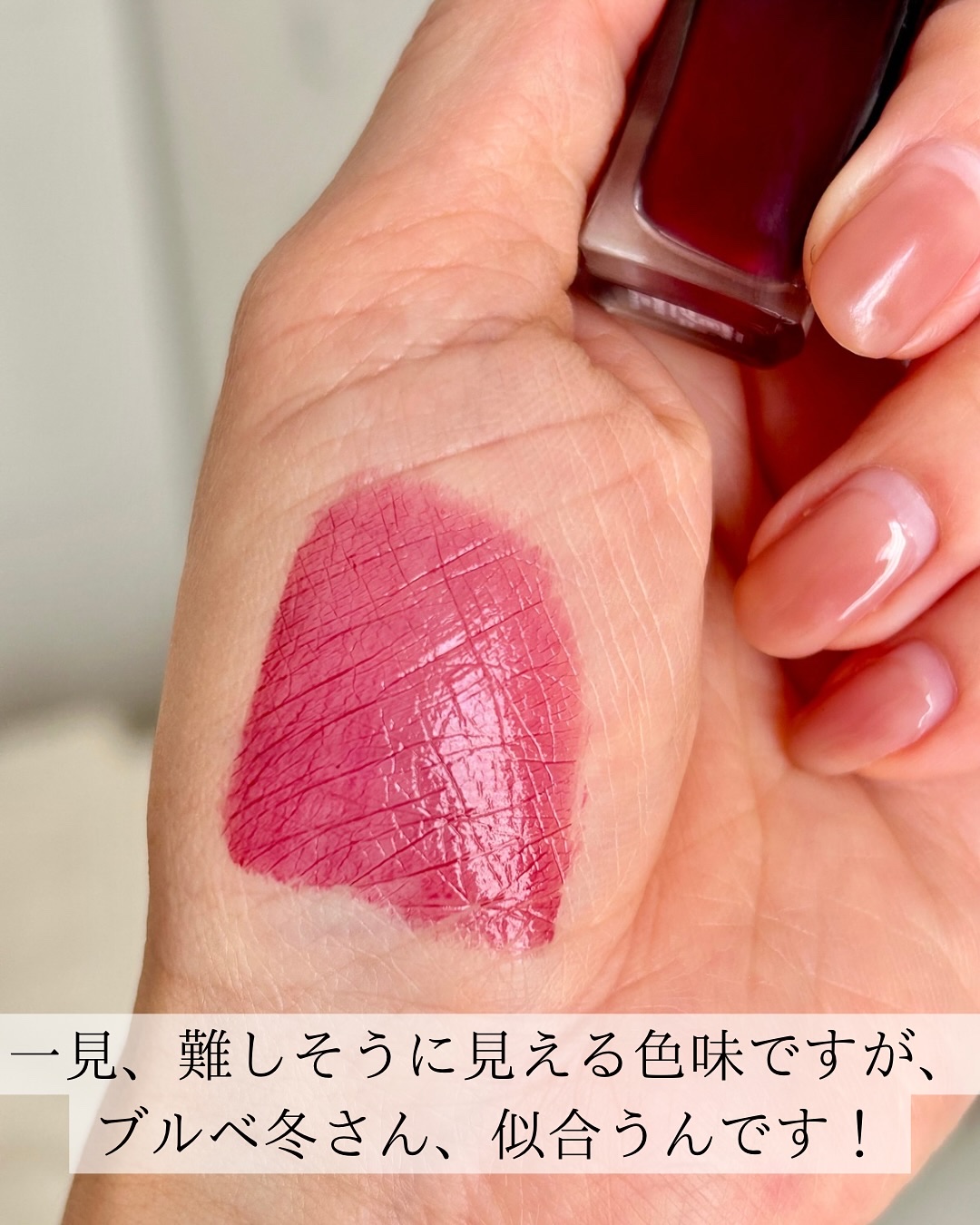 少しピンクみがかった、お洒落なワインレッドカラー❤️🔥 塗った瞬間はツヤ感があるけど、時間が経つとセミマットみたいな質感に🫧 青みピンクっぽく発色し、紫っぽくも見えるのでブルベさんにおすすめのカラーです☺︎ ぜひチェックしてみてね💫