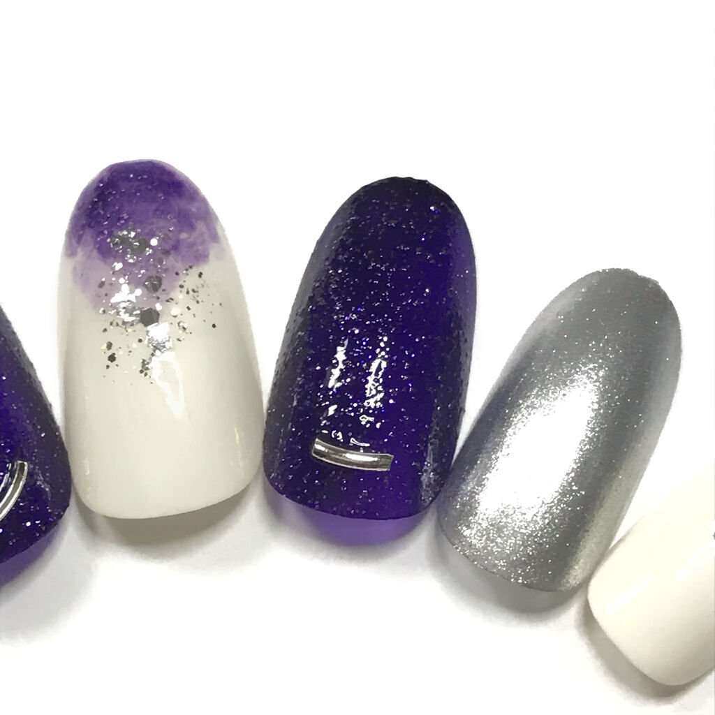 新色のニュアンスカラー💓 綺麗なパープルにラメがチラチラ可愛い🌟 1度塗りだと少しシアーな感じでムラになりやすいので2度塗りしてます😊 人差し指と小指のニュアンスはソンプチューの白2度塗りで爪先に1滴パープル落としてトップコートでボカしてAT ネイルグリッター03シルバーを真中に🎵 パーツはseriaのです🐰 普段使わないカラーもたまには良いなぁ💕