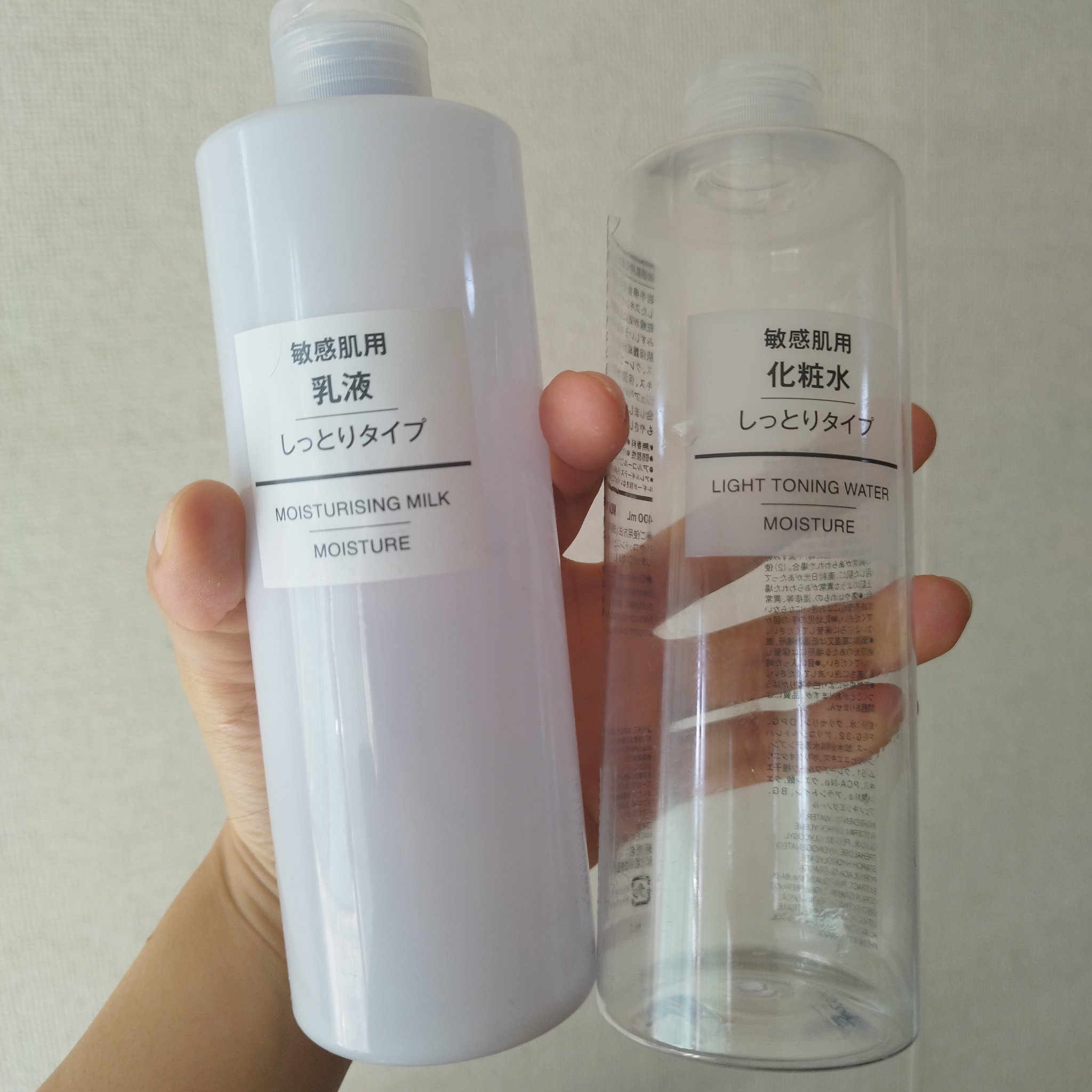 無印良品化粧水・敏感肌用・しっとりタイプ我が家は400mlのボトルを買ってスプレーノズルに付け替えています。顔にも体にもたっぷり使って、その上からクリームが定番。肌が荒れてる時も使えるので常に家に置いてます。家族全員が使える化粧品って貴重。