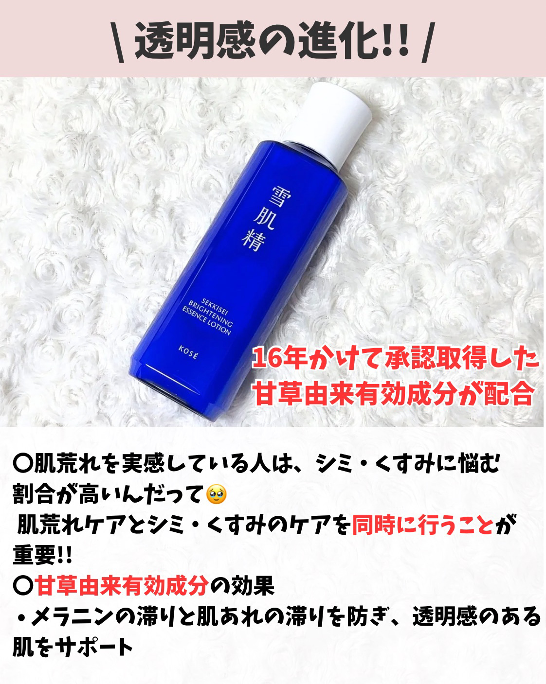 進化した薬用 雪肌精は 日本で初めて 有効成分グリチルレチン酸ステアリルSWにて 「美白」「肌あれ・あれ性」の効能を 承認取得されたそうです。 甘草由来成分が 肌の透明感を妨げるメラニンの滞りや 肌あれの滞りを起こさせないように アプローチするとのこと! あまりとろみが強くない シャバシャバ系のテクスチャで白い🤍 植物っぽいというか 薬用系の雪肌精ならではの香りがします。