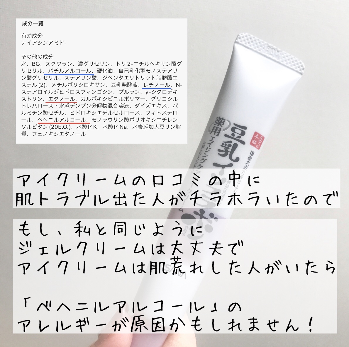✼••┈┈••✼••┈┈••✼••┈┈••✼••┈┈••✼【使った商品】なめらか本舗 薬用リンクルアイクリームホワイトなめらか本舗 リンクルジェルクリームNALBION エクサージュモイストアドバンスミルクIIIALBION エクサージュモイストアドバンスミルクⅡ✼••┈┈••✼••┈┈••✼••┈┈••✼••┈┈••✼大人気のなめらか本舗「薬用リンクルアイクリームホワイト」を使用したところ次の日に、赤く腫れてしまいましたたまたま、自分の肌の調子が悪かったのかもと思い1週間あけて再チャレンジしてみたのですがやはりまた赤く腫れ...A反応かも?と思い肌がレチノールに慣れるまで続けるべきかものすごく迷っていたのですがLIPS様の機能を利用してアレルギーだと気づくことができましたほんとに感謝!!「薬用リンクルアイクリームホワイト」に関しては、とっても期待していたし良い商品なのに私の肌には合わなくて残念ですがA反応だと勘違いして無理して続けていたらアレルギーが悪化して取り返しのつかないことになっていたかもしれないので今回は、アレルギーだと気づくことができたその方法についてシェアさせていただければと思います♪✼••┈┈••✼••┈┈••✼••┈┈••✼••┈┈••✼ご存知の方も多いかもしれませんが...(写真4枚目)商品ページの成分情報を選択するとアレルギー誘発の可能性がある成分や注意が必要な成分が確認できます(写真6枚目)まず、同じなめらか本舗のエイジングケア「リンクルジェルクリームN」は快適に使えていたので同じく、商品ページの成分情報にある成分一覧を比較してみました(写真7枚目)全成分だと多すぎて自分に合わない成分を絞り込めなかったけどアレルギー誘発の可能性がある成分には赤線注意が必要な成分には青線を引いて比較する成分を減らすことで見つけることができました結果、ジェルクリームにはなくてアイクリームだけにあるのは「べヘニルアルコール」だけでしたもし、私と同じようにジェルクリームは大丈夫だったけどアイクリームは肌荒れした人がいたら「べヘニルアルコール」のアレルギーが原因かもしれません私の場合は、以前、ALBIONのエクサージュモイストアドバンスミルクIIIで、アレルギーが出たことがあるのでさらに、こちらと成分を比較してみました結果、「べヘニルアルコール」が入っていました(何年も原因探してて分からなかったので 2つが一致した瞬間は感動しました)今まで原因が分からず最初にアレルギーが出た「乳液」をやみくもに避けていたのですが今後は、べヘニルアルコールだけ避ければ良いと分かってかなりの収穫となりました本当に嬉しい!!!この方法なら誰でも自分のアレルギー成分が見つけられるかと思います(ちょっと手間ですがその価値はあるかと)事前に分かればトラブルを避けられるし購入時の参考にもなると思ってシェアさせていただきましたみなさんの肌トラブルが減りますように♡✂ーーーーーーーーーーーーーーーーーーーーアレルギーの出た商品はいずれも私がアレルギーなだけで商品自体は良いものだと思いますALBIONのエクサージュモイストアドバンスミルクに関してはむしろ2〜3年くらいすごく肌の状態が良くて気に入って使っていました突然、アレルギーが出て驚いたのですが今回、調べてみて謎が解けました以下の3タイプあるのですがべヘニルアルコールが含まれているのはミルクIIIだけ!ミルクⅠ→さっぱりミルクⅡ→普通の肌向けミルクIII→乾燥肌向けそういえば、ずっとミルクⅡを使用していたのですがアレルギーが出たタイミングはちょうど、冬場で肌が乾燥するからとミルクIIIを試しに使っていましたもうこのシリーズは一生使えないと思っていたのですがミルクⅠとミルクⅡなら使えることが分かりました自分の肌を知るって大きいなと思いました✂ーーーーーーーーーーーーーーーーーーーー2024/8/3118:30追記なめらか本舗 薬用リンクルアイクリームホワイトをなめらか本舗 リンクルアイクリームNと間違えて、レビュー作成してしまったので全体的に内容修正しました2024/8/31の朝から半日くらい間違った状態になっていました修正前に、ご覧いただいた方はすみませんでした🙇♀️✂ーーーーーーーーーーーーーーーーーーーー・ランキング機能などで 自分の肌に合わない成分を簡単に見分ける方法https://lipscosme.com/posts/6803365?_t=zLqY&_r=nq7yeG#アレルギー#肌トラブル#アトピー肌