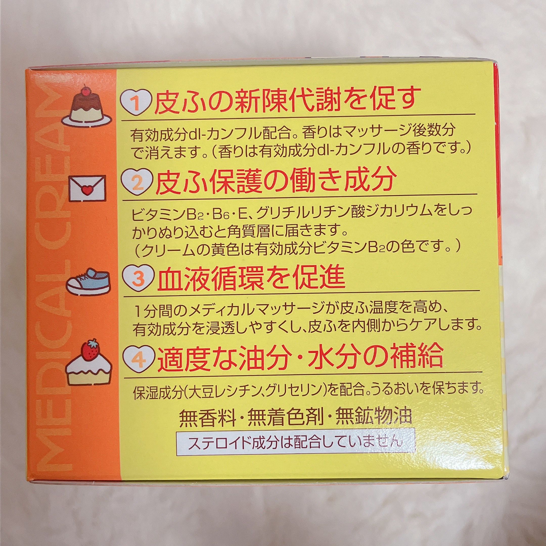 ✂ーーーーーーーーーーーーーーーーーーーーメンタームメディカルクリームG 薬用クリームGポムポムプリン限定パッケージ今年はポムポムプリン×ハローキティーデザインちょっと手ごわい肌あれにビタミンB2 B6 E香りが消えるまでしっかりぬりこむ1分間のメディカルマッサージ①皮ふの新陳代謝を促す 有効成分dIカンフル配合。香りはマッサージ後数分で 消えます。②皮ふ保護の働き成分 ビタミンB2 B6 E、グリチルリチン酸ジカリウムを しつまかりぬりこむと角質層に届きます。 クリームの黄色は有効成分ビタミンB2の色です。③血液循環を促進 1分間のメディカルマッサージが皮ふ温度を高め、 有効成分を浸透しやすくし、皮ふを内側からケア します。④適度な油分 水分の補給 保湿成分(大豆レシチン、グリセリン)を配合。 うるおいを保ちます。〇無香料 無着色剤 無鉱物油ステロイド成分は配合していません。今年のコラボ可愛かったので購入しました。毎年冬になるとタイツを脱いだ時に肌が粉を吹いていたりすることがあるので、乾燥してるなーと思います。そういうことを少なくするためにもこまめに塗ろうと思います!メンターム#メディカルクリームG#薬用クリームG#ポムポムプリン限定パッケージ#2024#ポムポムプリン#キティ