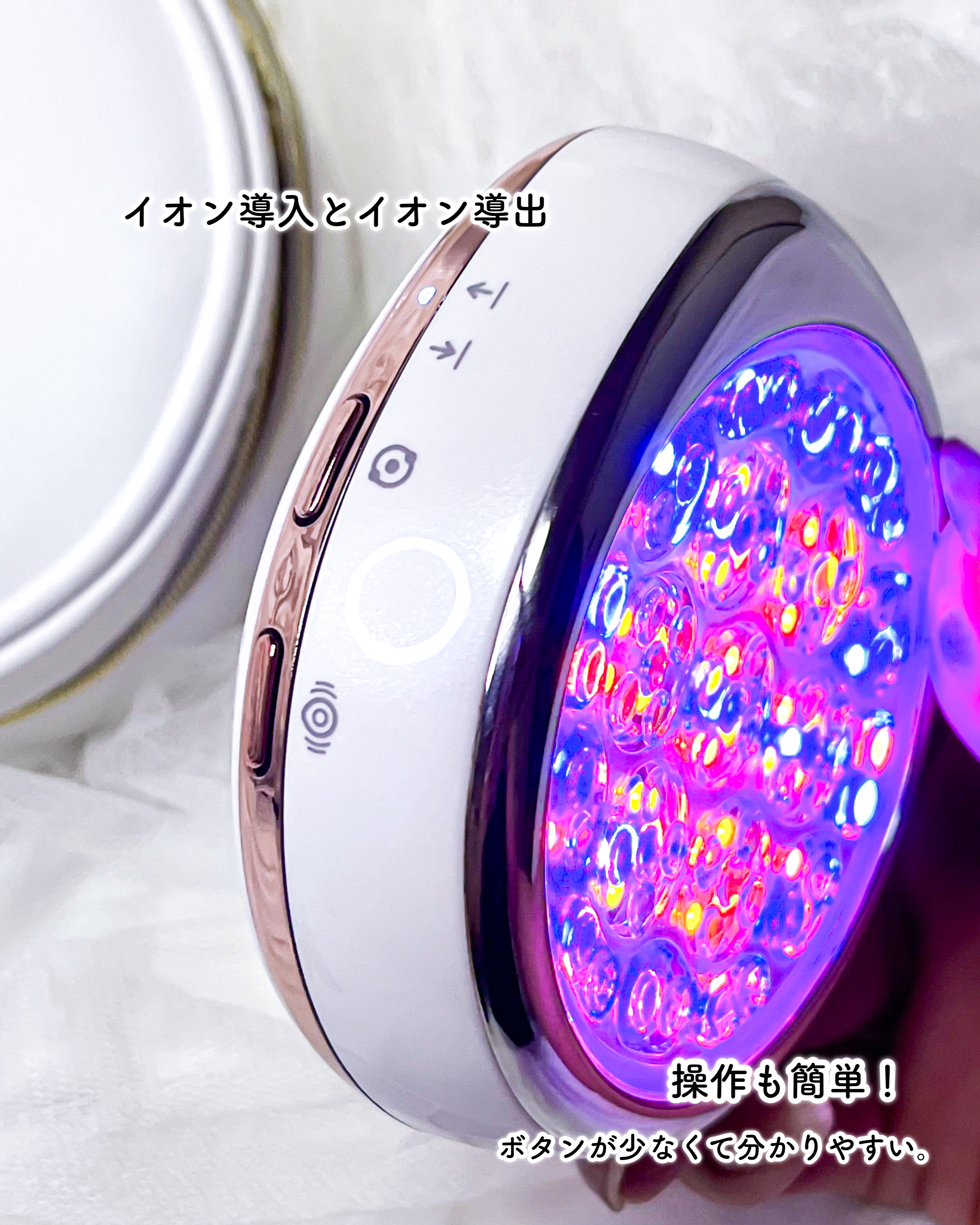 LED美顔器のパイオニア エクスイディアルが作った高機能ハンディーモデル コロンと丸いフォルムで、ホールドリングがあるおかげで安定感があり、手にしっくりとおさまり持ちやすく これ1つで6つのケアができる上にボディケアにも使え、充電式なのでコードレスで使えて持ち運びにも便利な所