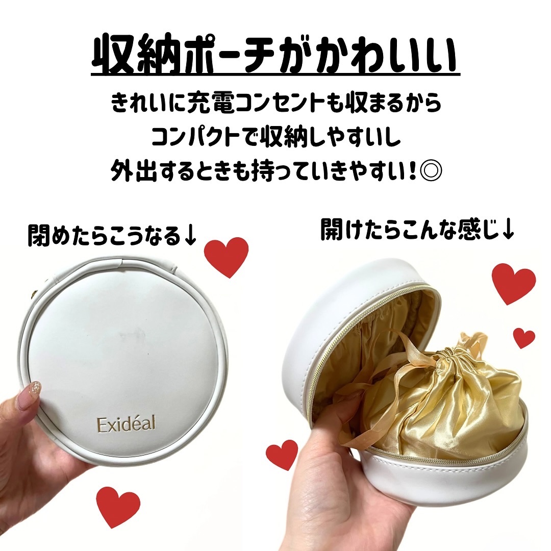 Exidéal独自のLEDプログラムに加えてイオン導出・イオン導入をあわせた全6プログラム𓂃🫠🤍 組み合わせ自由な円運動3Dのバイブレーションは、肌に心地よい振動を与えて美肌効果を高めてくれる.ᐟ.ᐟ 手で持ちやすい用ホールドリングがあるのでバイブレーションや長時間持っていても安定し、落下防止の役目も果たしてくれるから安心 ☺️💕 サイズ感もちょうどよくてポーチもあるので旅行や帰省にも持ち運び便利✨カラーも3色展開でホワイト / ピンク / ブラックとどれも高級感あって、おしゃれ🕊🌿 スキンケアと一緒に使用できる耐水加工なりたい肌にあわせて選べる全6プログラム+バイブレーション機能!