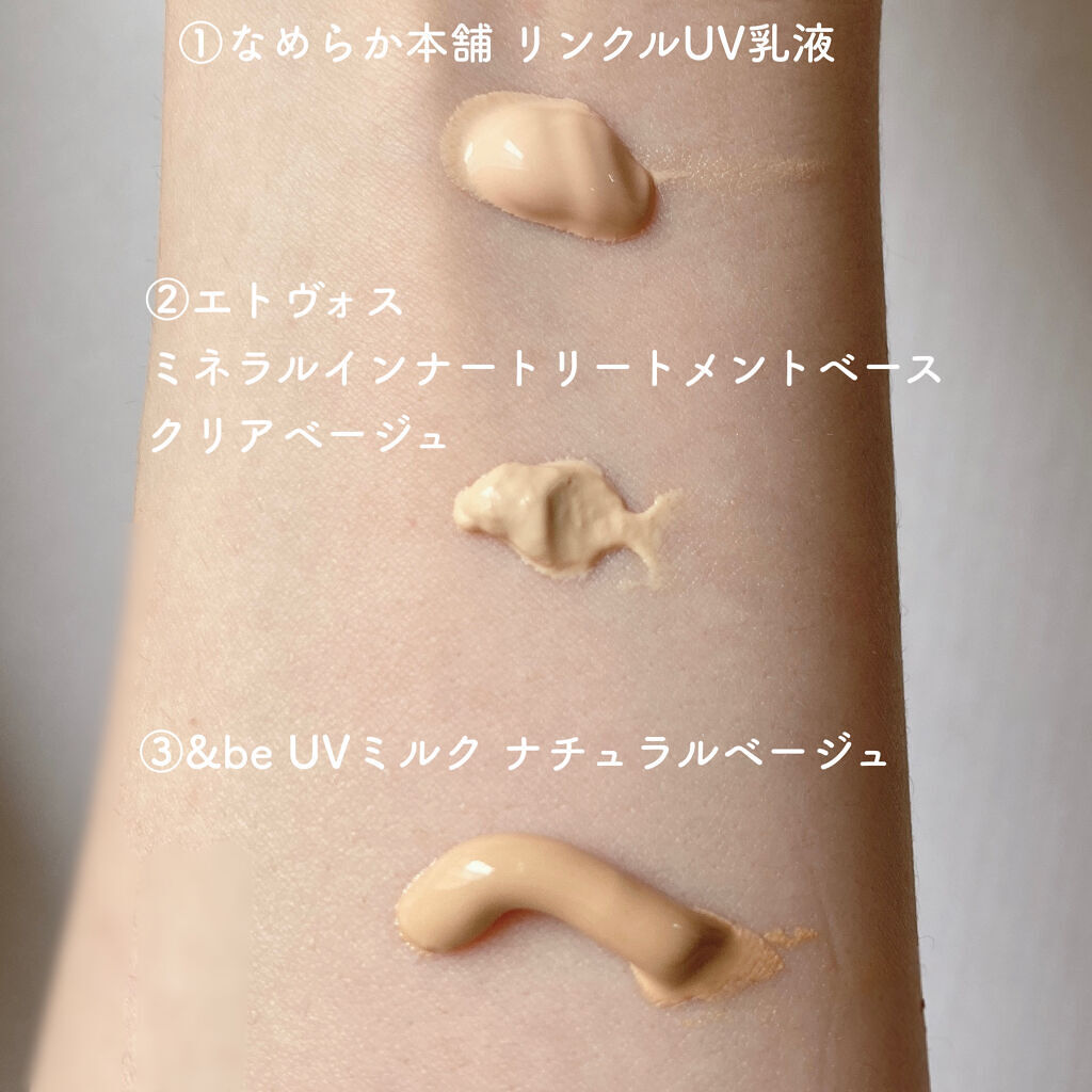 以前動画レビューした日焼け止めor日中用乳液の写真でのレビューです①なめらか本舗リンクルUV乳液50g・1,100円日中用乳液なので化粧水の後これですペタペタ系の美容液とか使うとムラできがちパウダーとかファンデ重ねない方がおすすめって書いてますツヤツヤ系で伸ばすとそこまで色はつかないけどなんとなく綺麗な肌に見えます②エトヴォスミネラルインナートリートメントベースクリアベージュ(美容液・化粧下地)現品:25ml・4,950円①と似ている感じですペタペタ系で保湿力が高いので冬とかに良さそうこちらも伸ばすと透明に近いオレンジ精油ぽい香り③&beUVミルクナチュラルベージュ顔・からだ用日焼け止め30g・1,980円/120g・3,080円この中だと一番しっかりめのテクスチャーナチュラルベージュの方なので色付きちょっと濃いめですねこちらもオレンジ精油の香り②より強め🍊動画レビュー🎥https://lipscosme.com/posts/4055234
