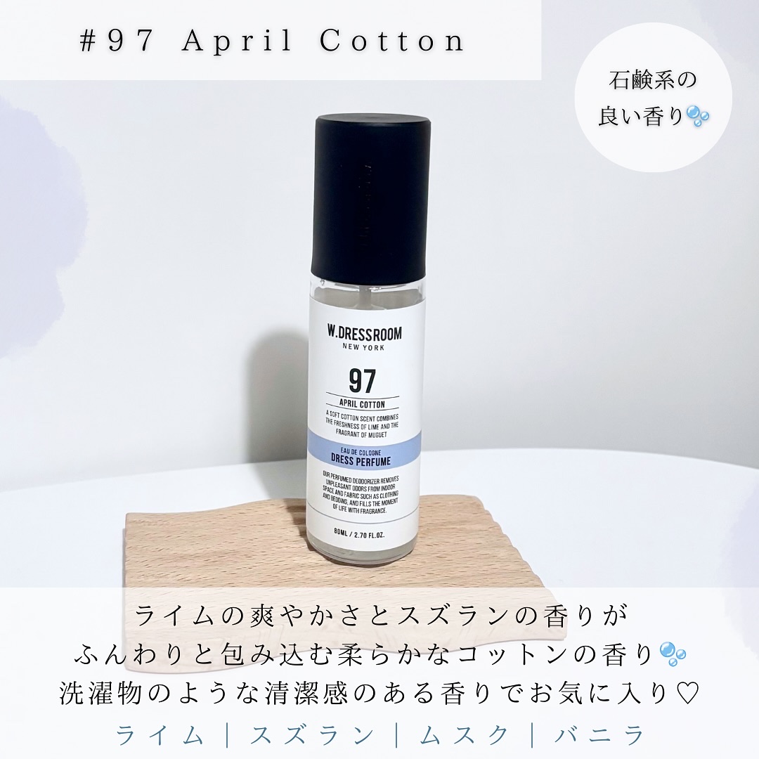特にNo.97のエイプリルコットンは某大物韓国アイドルがメンバーに送ったとされていて、人気沸騰中みたいです🔥(香りも洗い立てのシーツのような優しい香りでめちゃ良いです☁️) 除菌・消臭効果テスト済みのフレグランススプレーで、毎日洗えないものも清潔に保ち、心地よい香りで毎日をさわやかな気分にしてくれるアイテム。 ドレス&リビング クリーン パフュームだと香りはそんなに持たないかな。リフレッシュに部屋にシュッとひと吹き!という感じで使っています✨