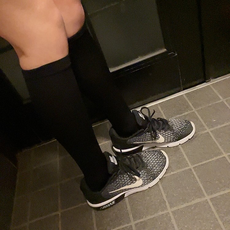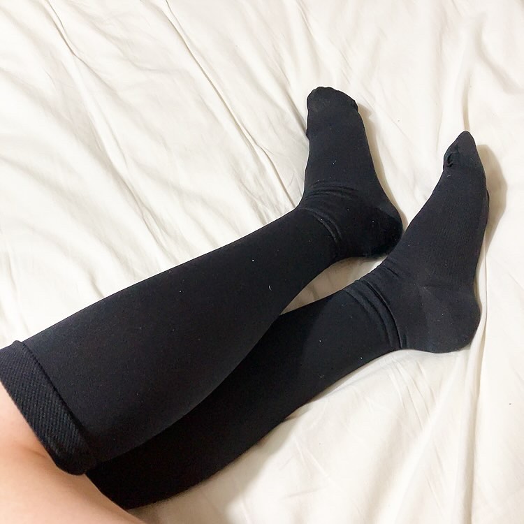 しっかりむくみ対策したい! 膝下までのハイソックスで、ほぼ伸びない素材って感じですが、ピタッとした履き心地。普通の靴下感覚で履けるし、見えてもダサくないのでいいですね!