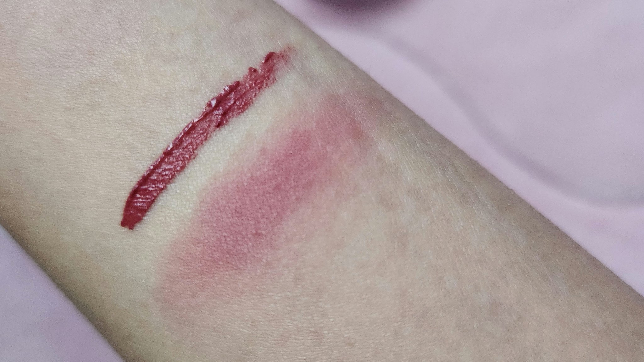 とても可愛らしい、ちょっとパープルみを感じるくすみピンクなのよ。 ティント効果はあまりないみたい。 恐らく、バシっと似合う方はブルベ夏。ライラックカラーが似合う方ね。 私はブルベ夏よりの冬なんだけど、やっぱりディープトーンのほうがバシっとくる。これはピンぼけみたいにモサッとする。敢えて使わなくてもいい感じね。 だから、これを使う日のメイクは気を使う。私の場合、色素薄い系に全てを整える必要があります。