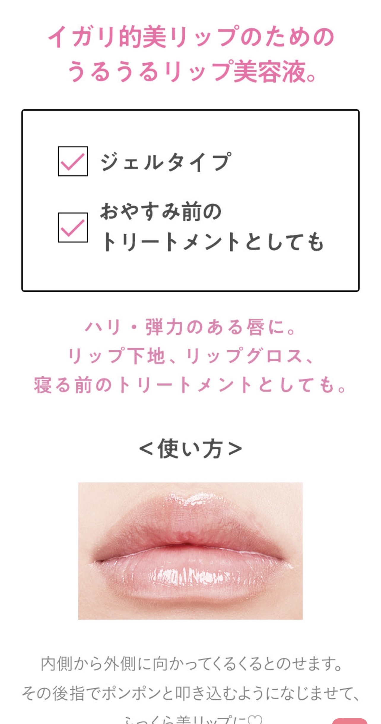 - イガリ的美リップのためのうるうるリップ美容液。 コクのあるテクスチャーで乾燥の気になる部分を保湿し、うるおいが持続。