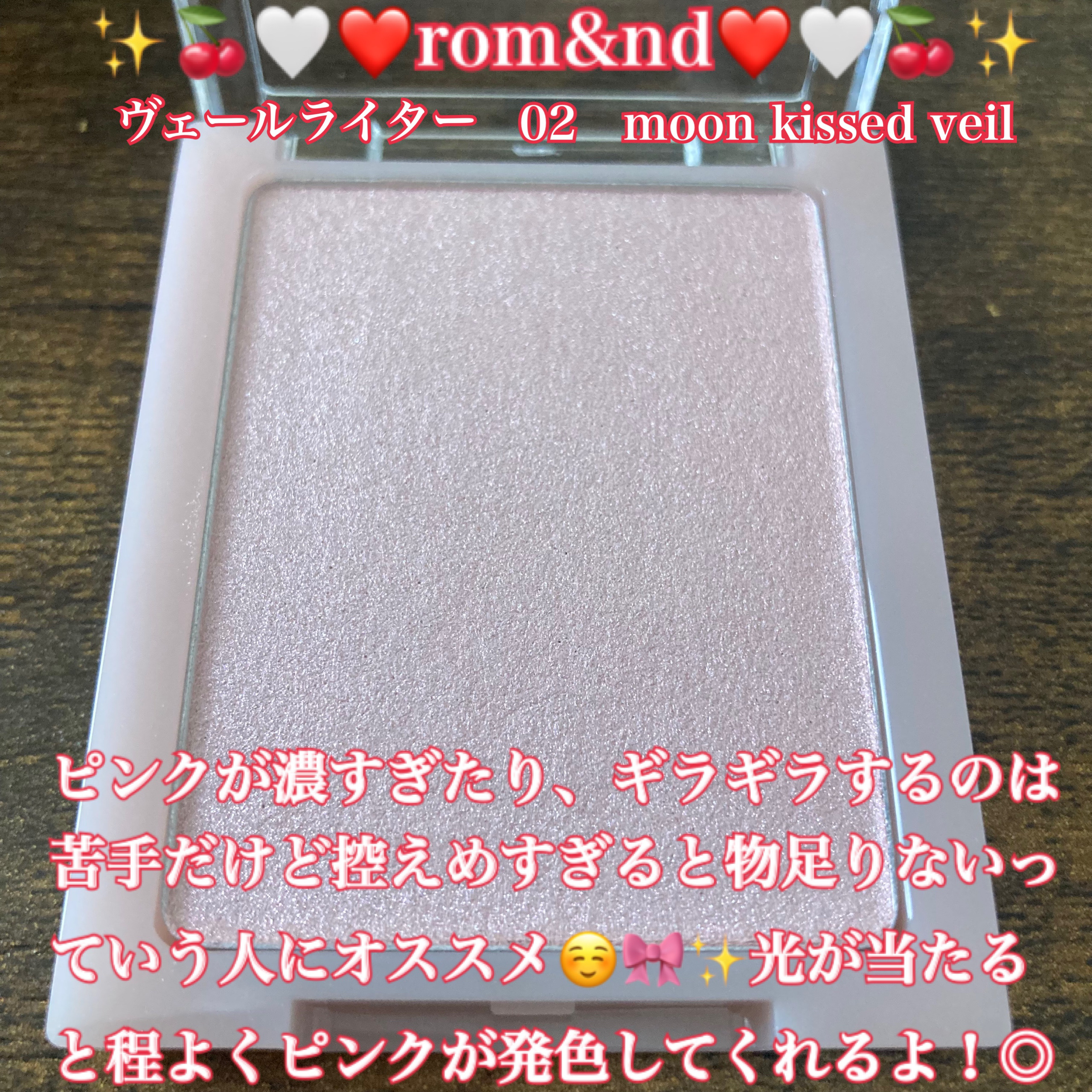 みち😼です。【rom&nd】ヴェールライター#02moonkissedveil/1430円🦋イエベ春の私で、01を買うか迷いましたが持ってるハイライトはベージュ系が多かったので02のこちらを購入☺️🩷…大正解でした!!発光したような濡れツヤ感...