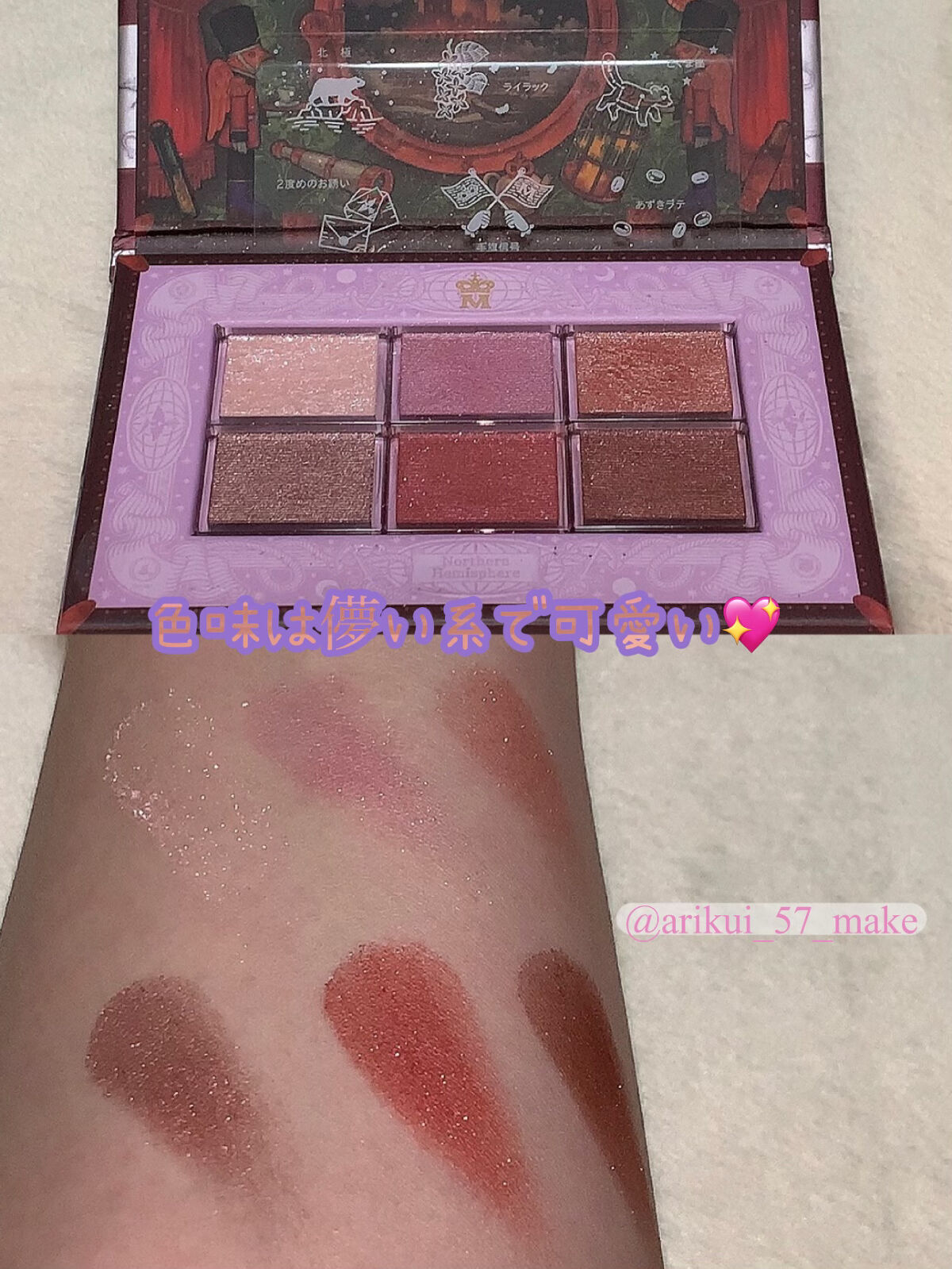 マジョマジョ限定パレットでオーロラライラックメイク❁︎マジョマジョさんのホリデー限定パレット、ナイストゥミーチュートランクの北半球を使ったアイメイク❅*°左下の甘さ控えめなピンクベージュ"2度めのお誘い"をアイホールに、下まぶたには上段真ん中...